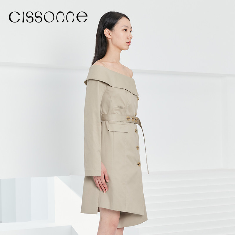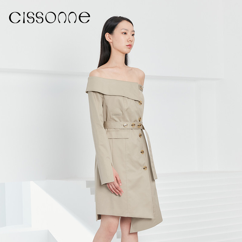 CISSONNE赛颂棉质裙子女气质OL高腰一字领收腰不规则开叉连衣裙