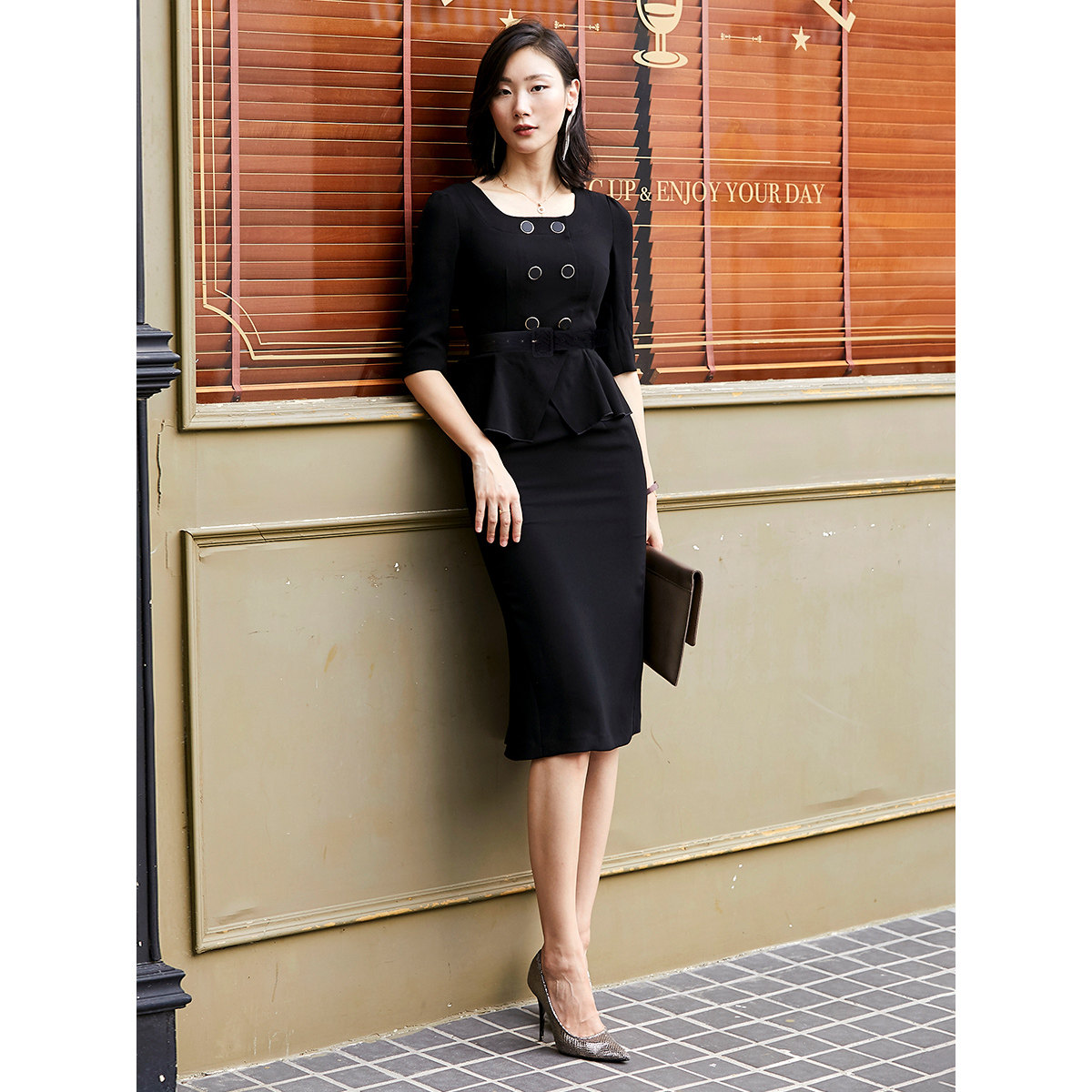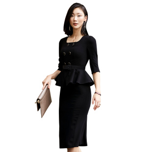 气质时尚 颈袖 长款 连衣裙收腰修身 通勤职业假两件包臀裙 添香秋新款
