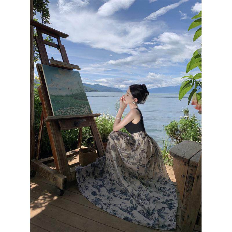 新中式 设计感连衣裙拼接高级感水墨印花复古显瘦国风吊带长裙新款