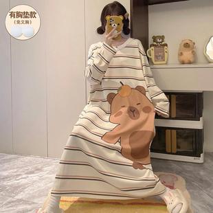 条纹家居服 加厚加绒冬天珊瑚绒长款 悦内睡袍女睡衣睡裙秋冬款 冬季