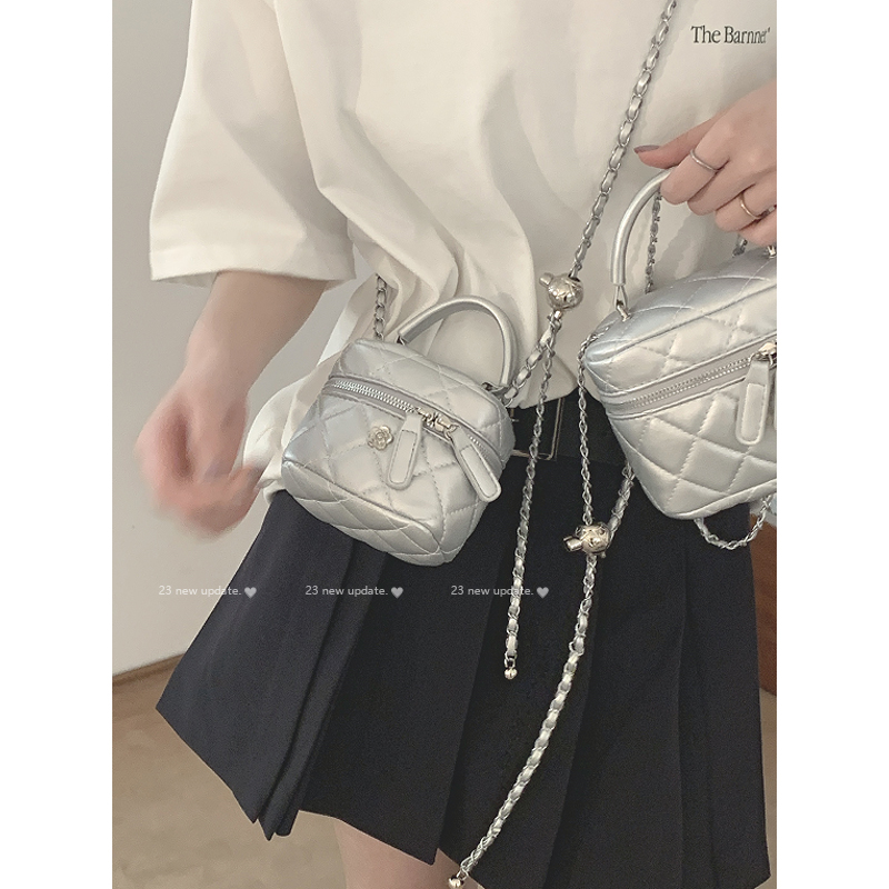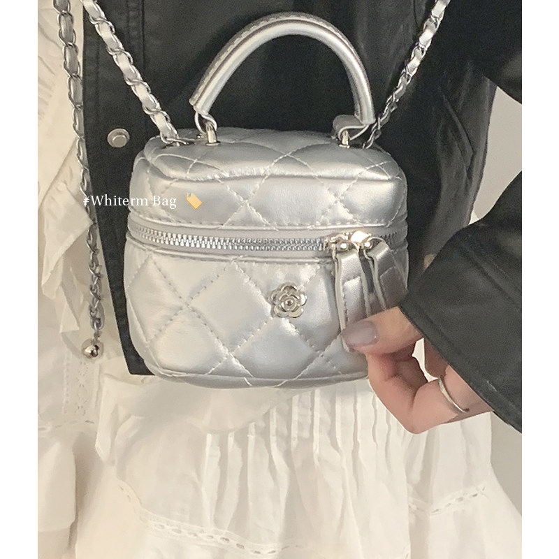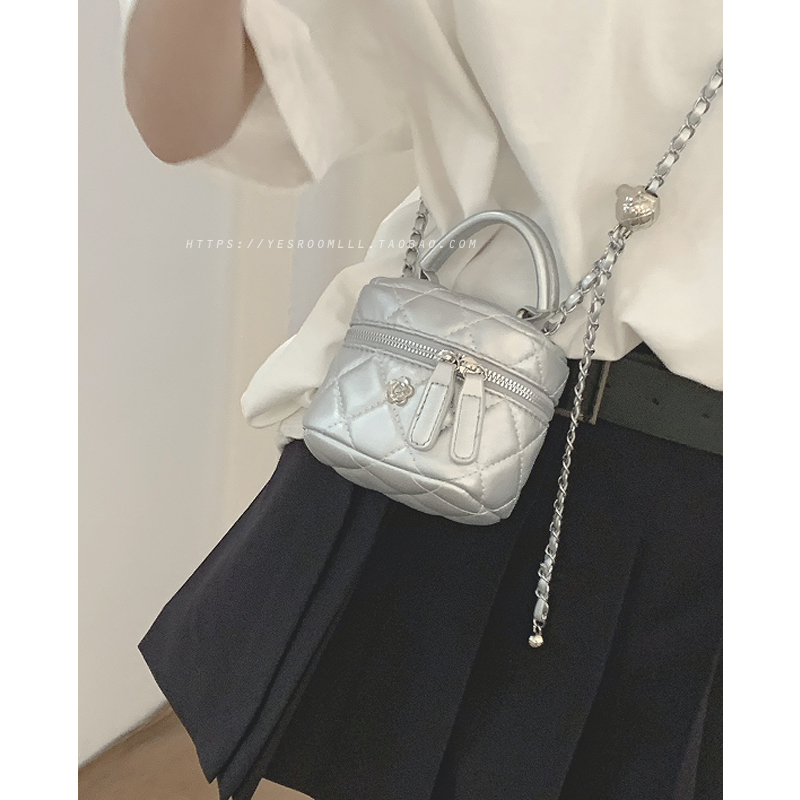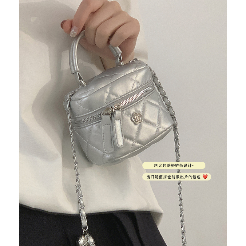 银色手提包包女2024新款 菱格链条包百搭ins斜挎包小水桶包 潮时尚