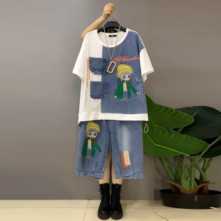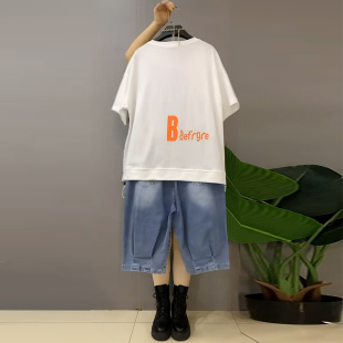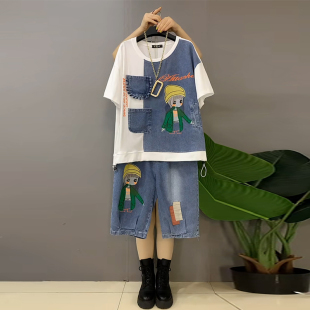 胖妹妹休闲减龄两件套 字母女孩拼接牛仔T恤上衣六分裤 加大码 女装