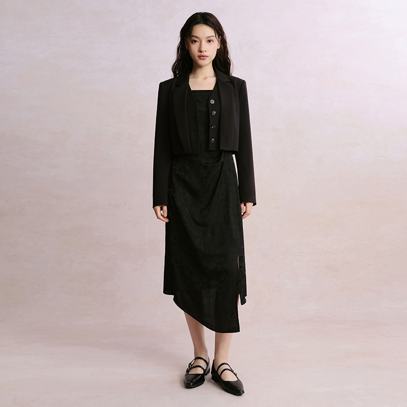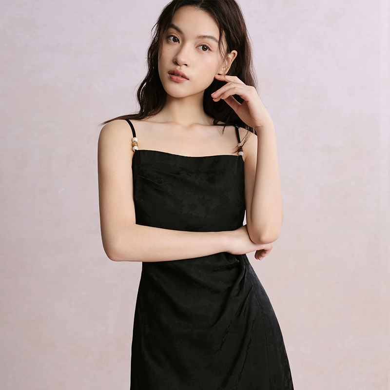 PIT法式 复古黑色露肩吊带连衣裙女2025夏轻薄透气内搭中长裙