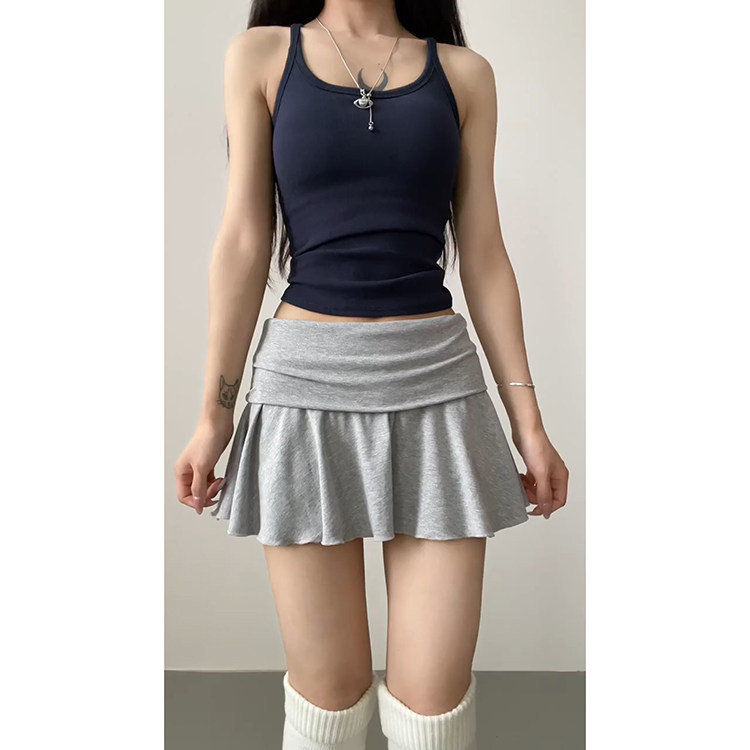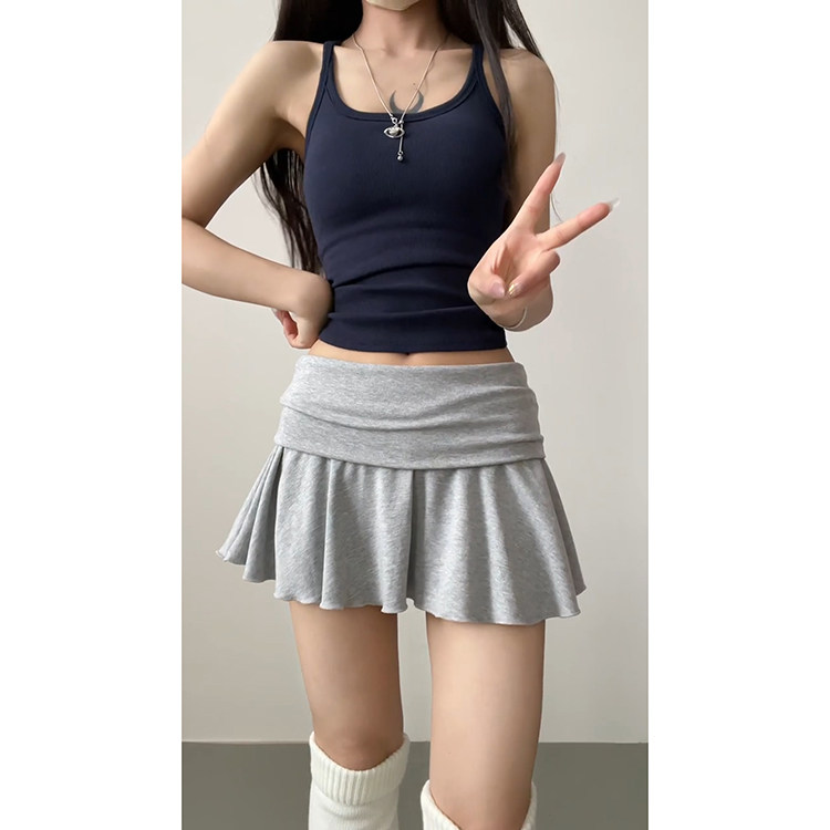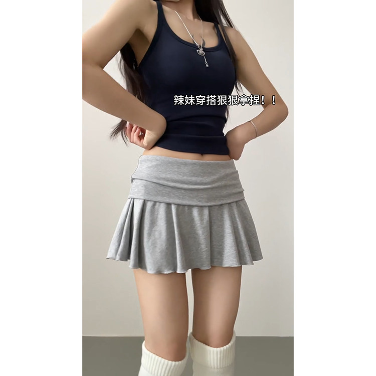 2026新款 荷叶边翻腰短裙女夏季 松弛感慵懒百搭灰色网球裙 时尚 美式