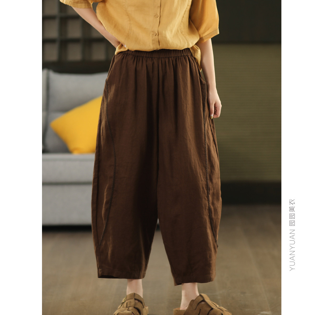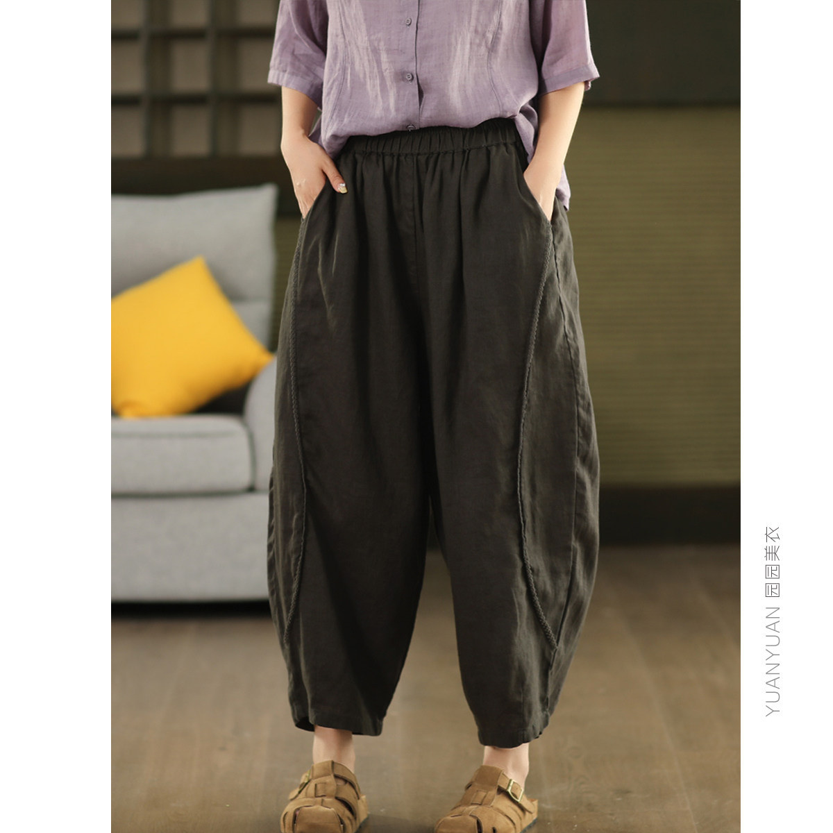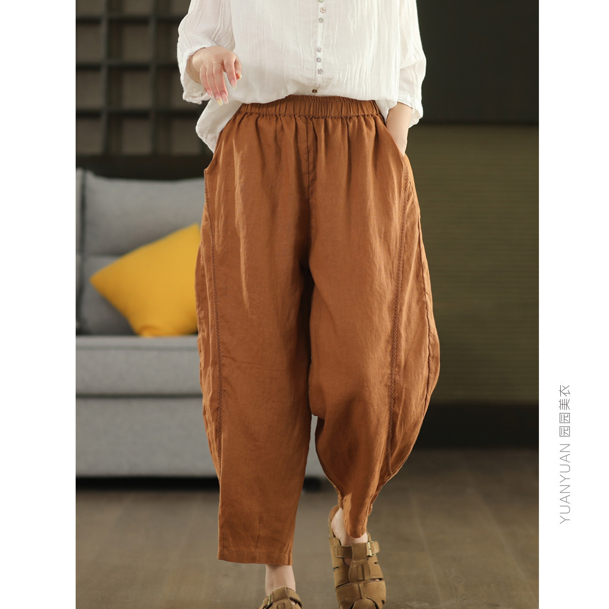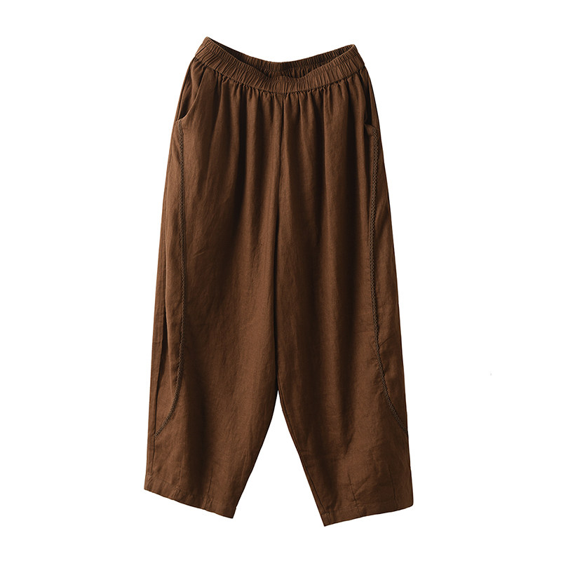 九分裤 园园美衣复古敦实100%亚麻哈伦裤 女拼接钩花边显瘦宽松麻裤