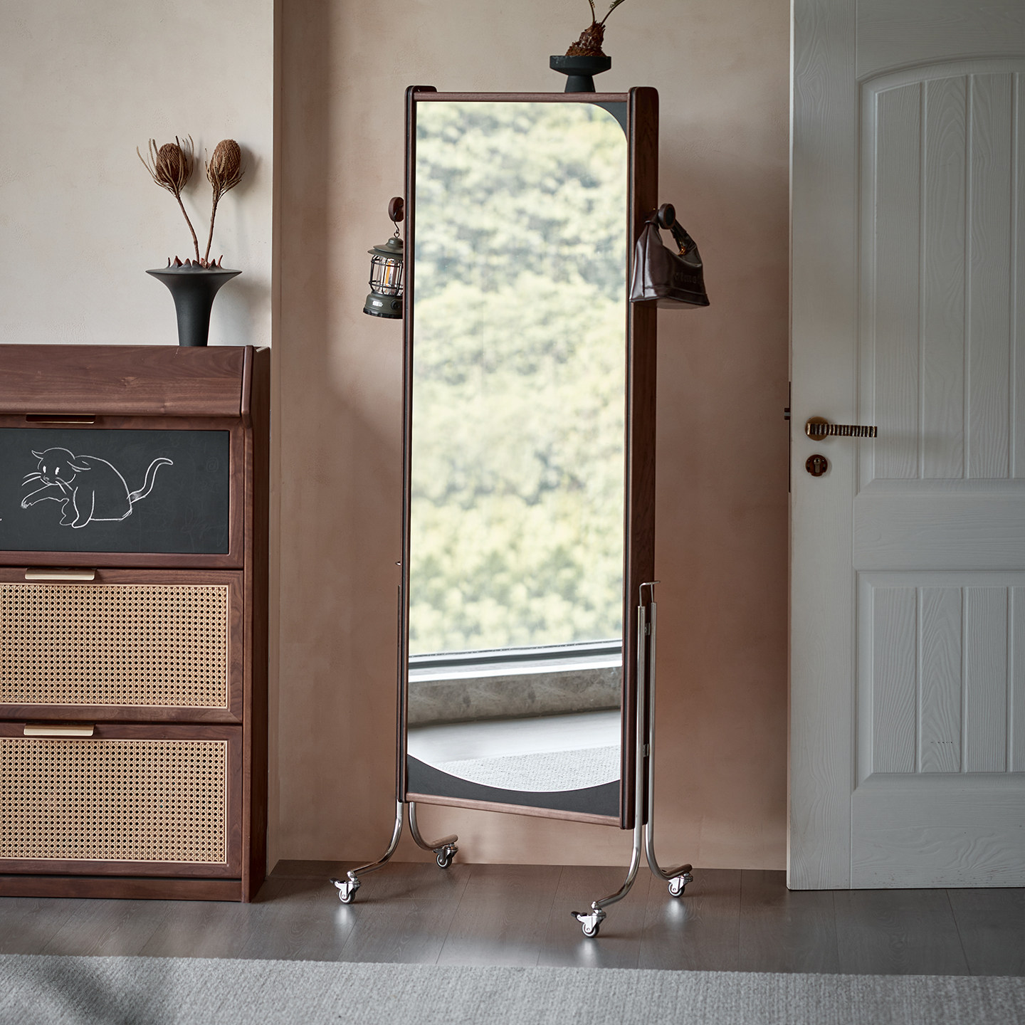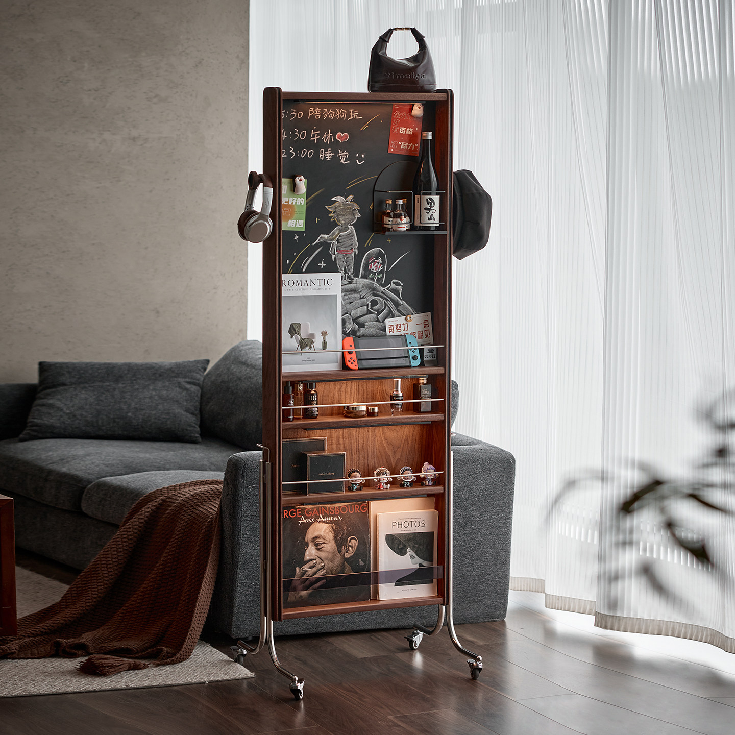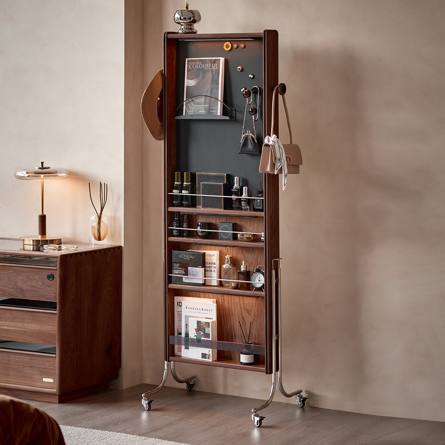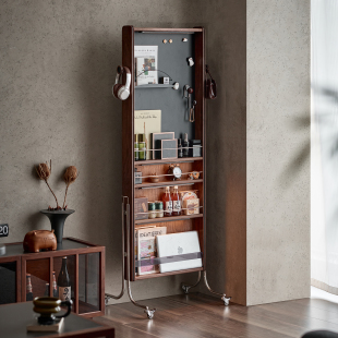 黑胡桃木全身镜试衣镜实木杂志架镜落地书报刊架可移动架子穿衣镜