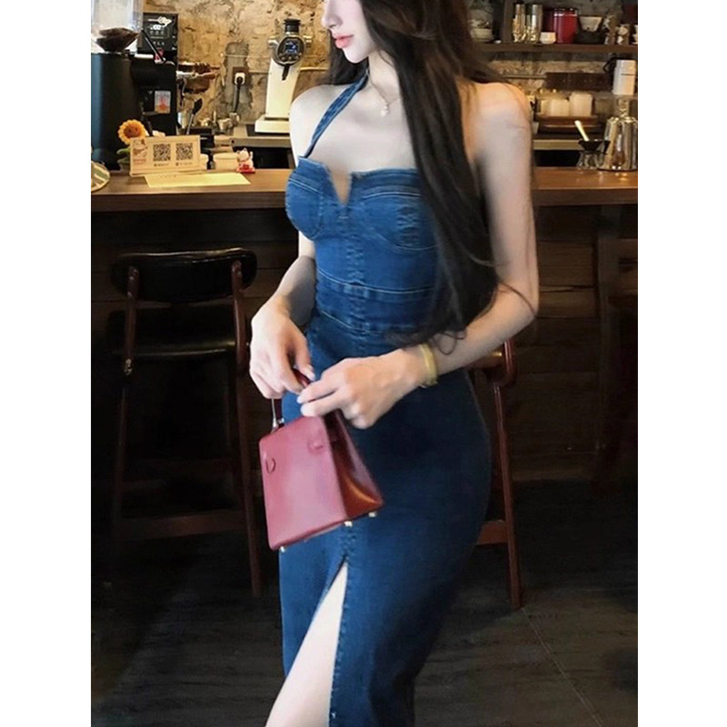 开叉牛仔长裙 修身 XZY 微胖御姐港风蓝色挂脖抹胸连衣裙女25年夏季