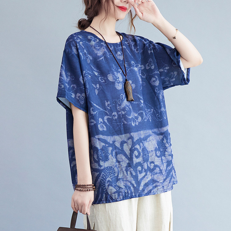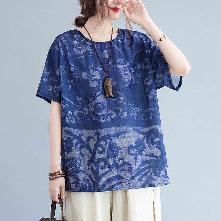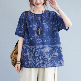 胖MM复古抽象印花棉麻短袖 夏装 T恤洋气遮肉显瘦百搭上衣 女装 大码