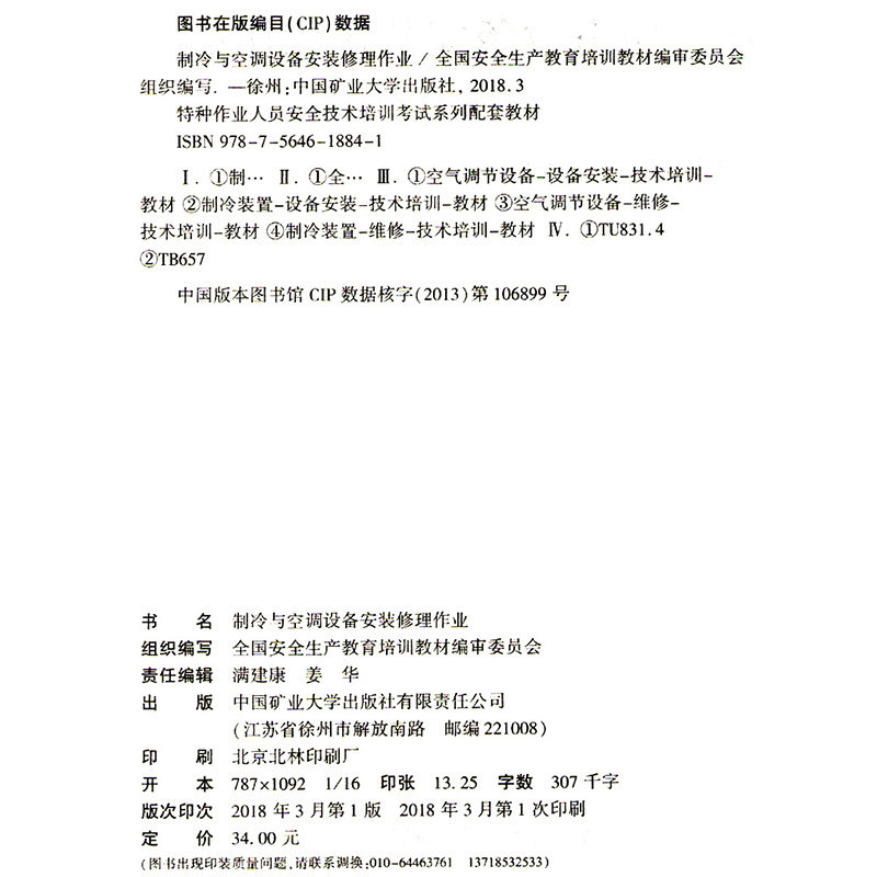 中国矿业大学出版 制冷与空调设备安装 特种作业人员安全技术培训考试系列配套教材 2018修订版 社2 修理作业