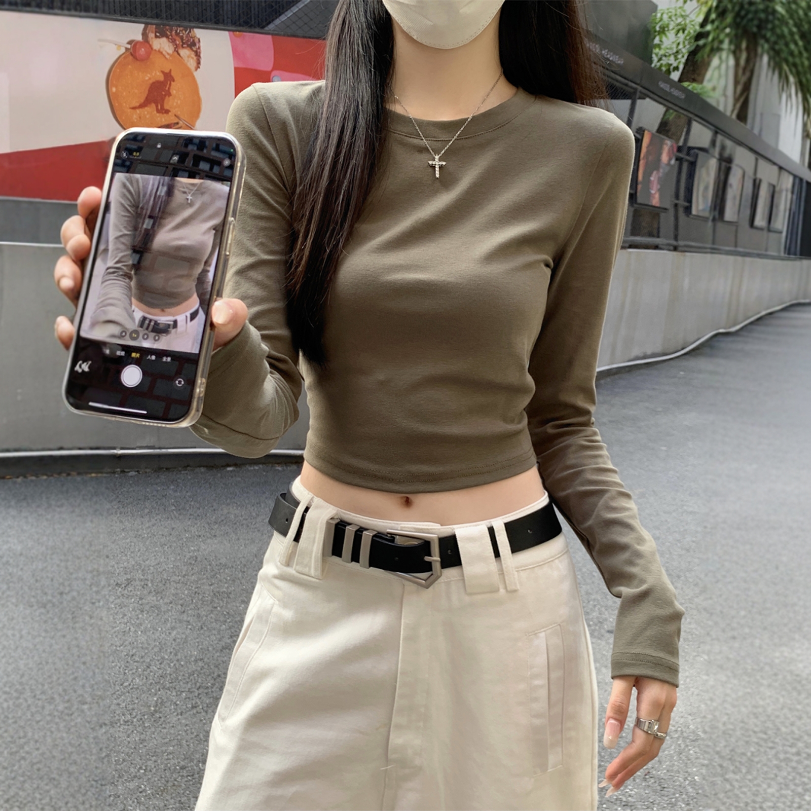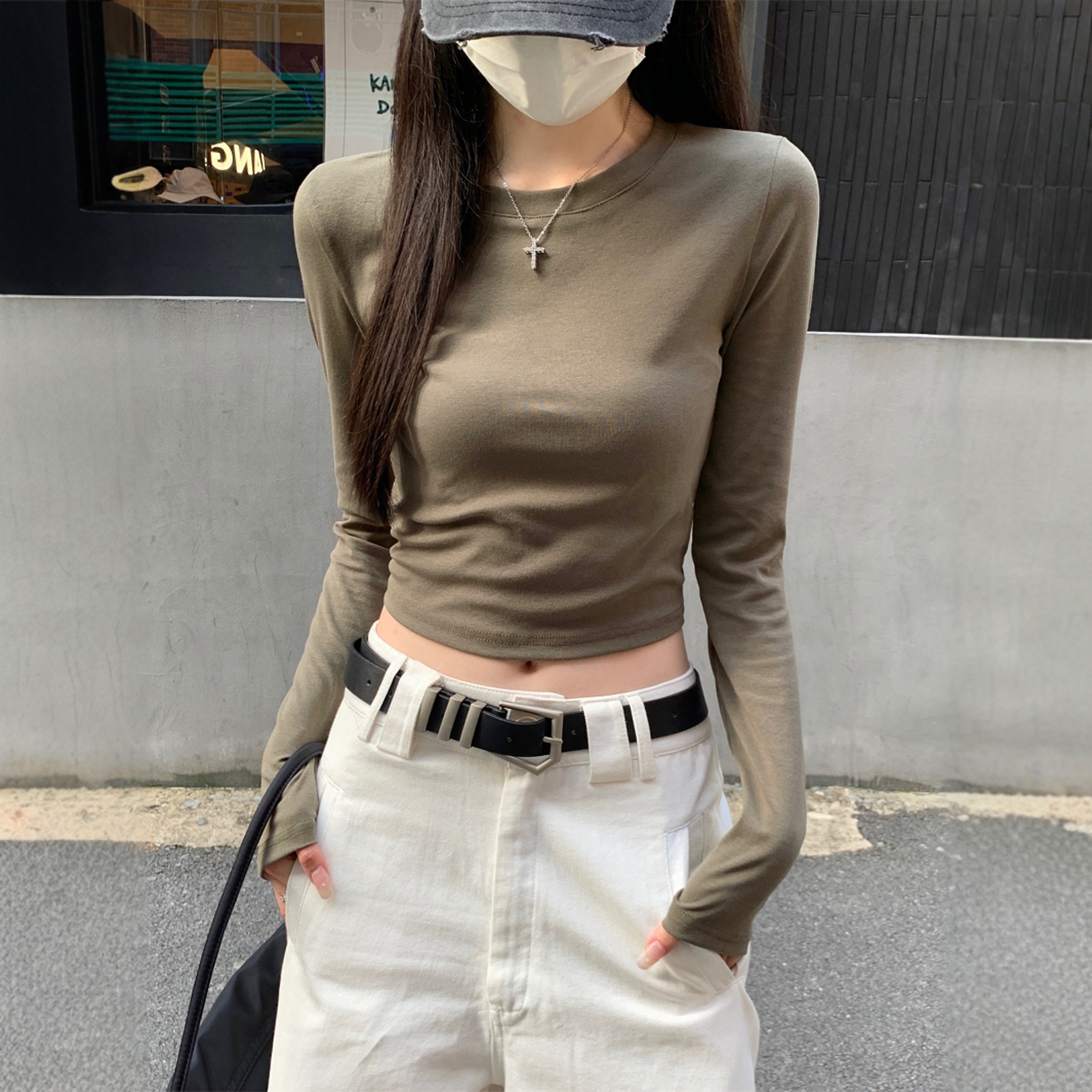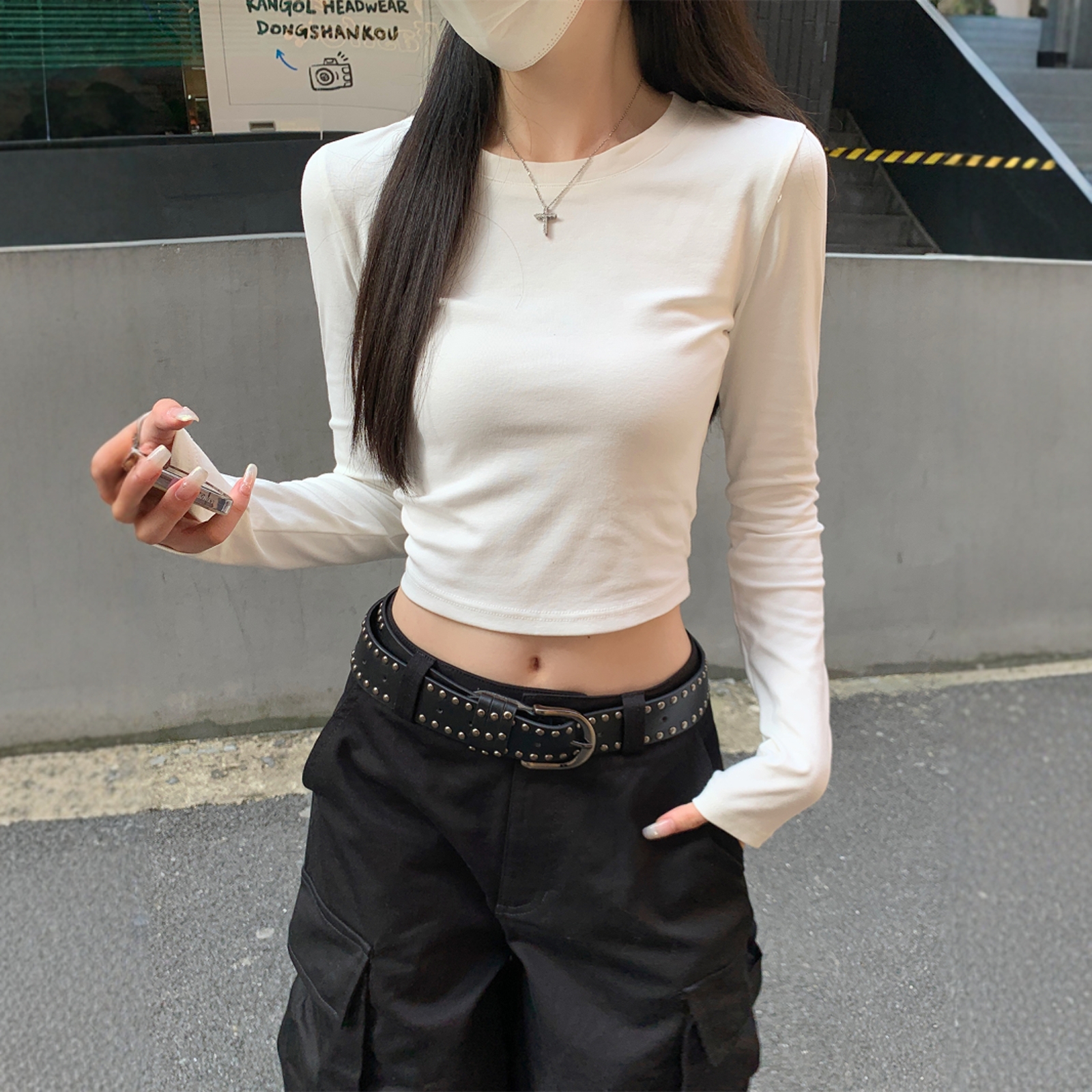 打底衫 辣妹长袖 内搭上衣女 露肚子短款 白色t恤女秋冬韩系圆领修身