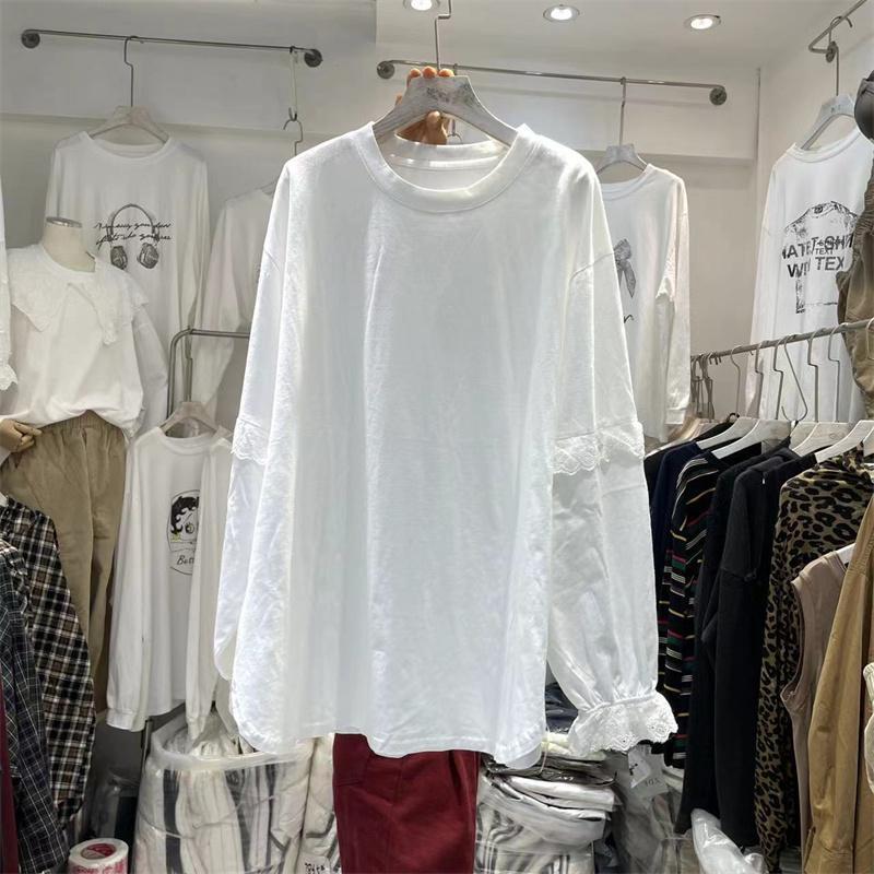 圆领拼接蕾丝花边T恤女宽松中长款 韩版 上衣 2024秋冬新款 300斤大码