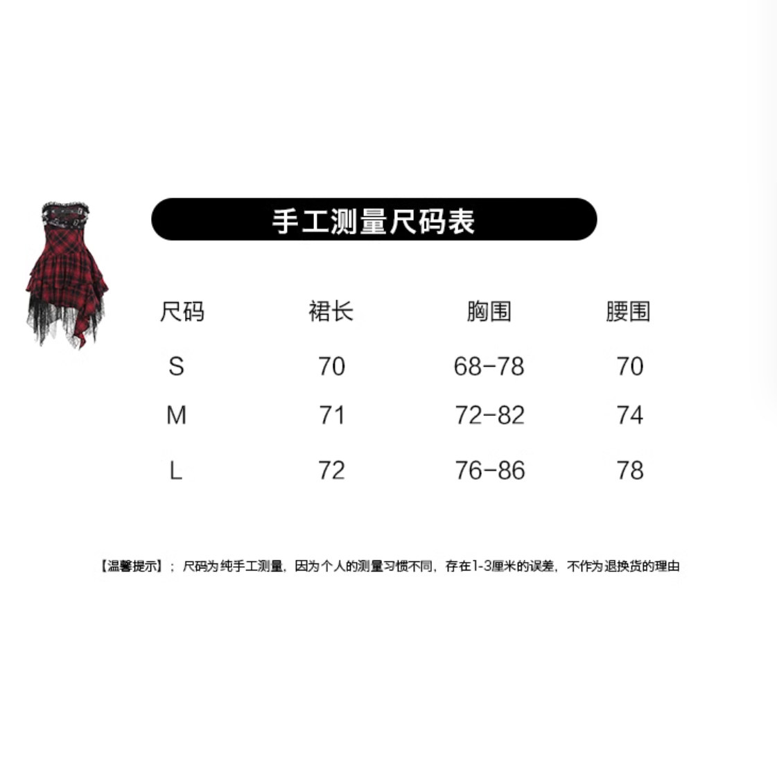 LIULIUGE亚文化辣妹红黑格纹抹胸一字肩皮带蕾丝拼接不规则连衣裙
