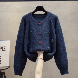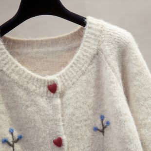 手工花圆领毛衣外套女2026春秋新款 宽松慵懒风外穿上衣厚针织开衫