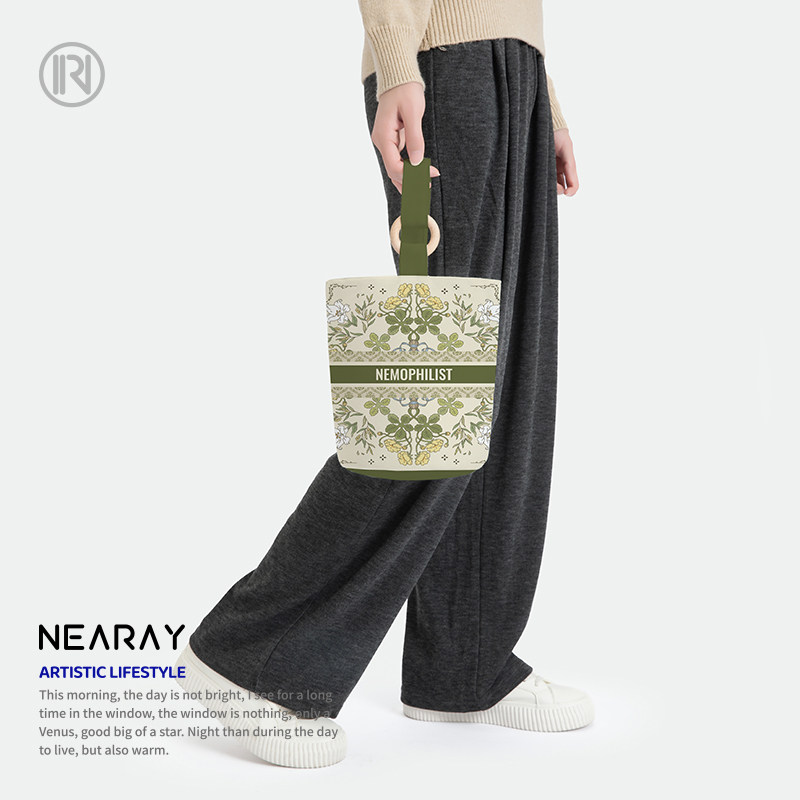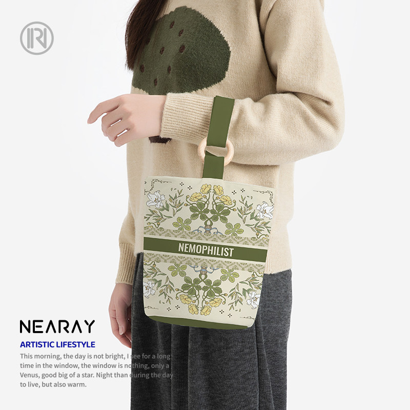 尼睿新款 原创小众绿色清新手拎包简约百搭文艺便携帆布水桶包AS