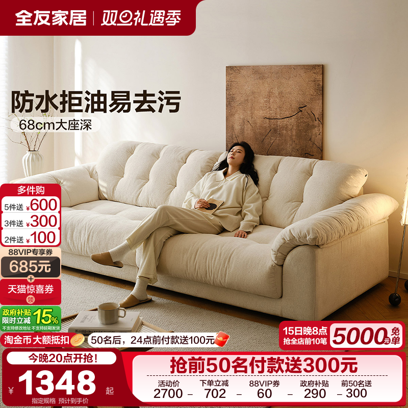 全友家居2025新款 奶油风可拆洗布艺沙发客厅小户型直排云浪沙发