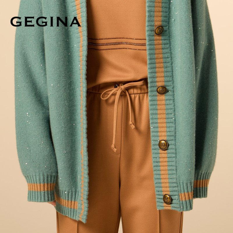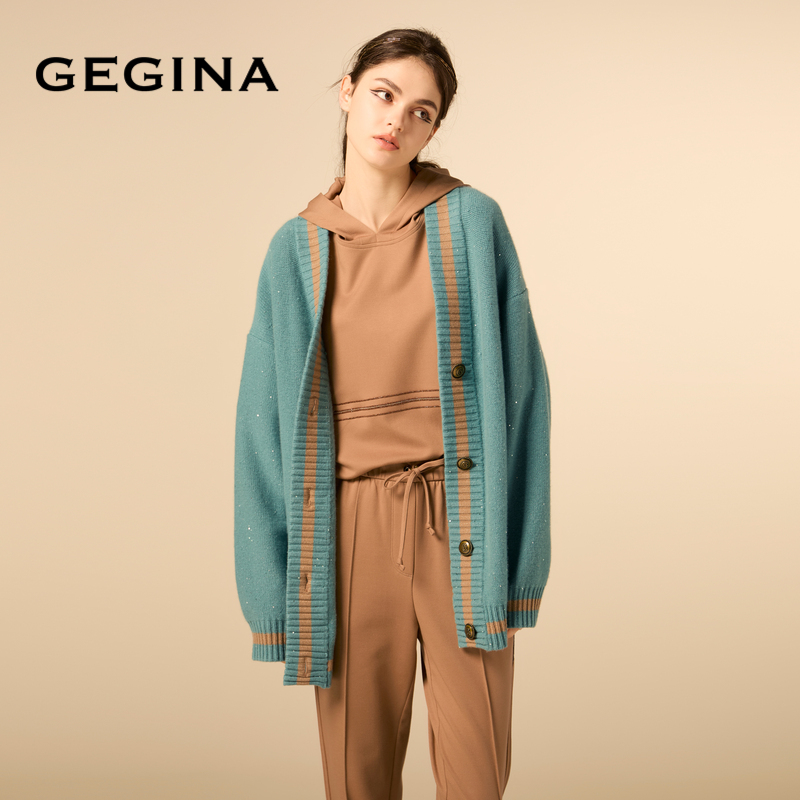 外套女商场同款 GEGINA吉吉娜山羊绒混纺针织开衫 撞色保暖中长款