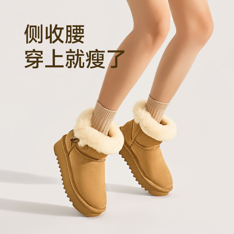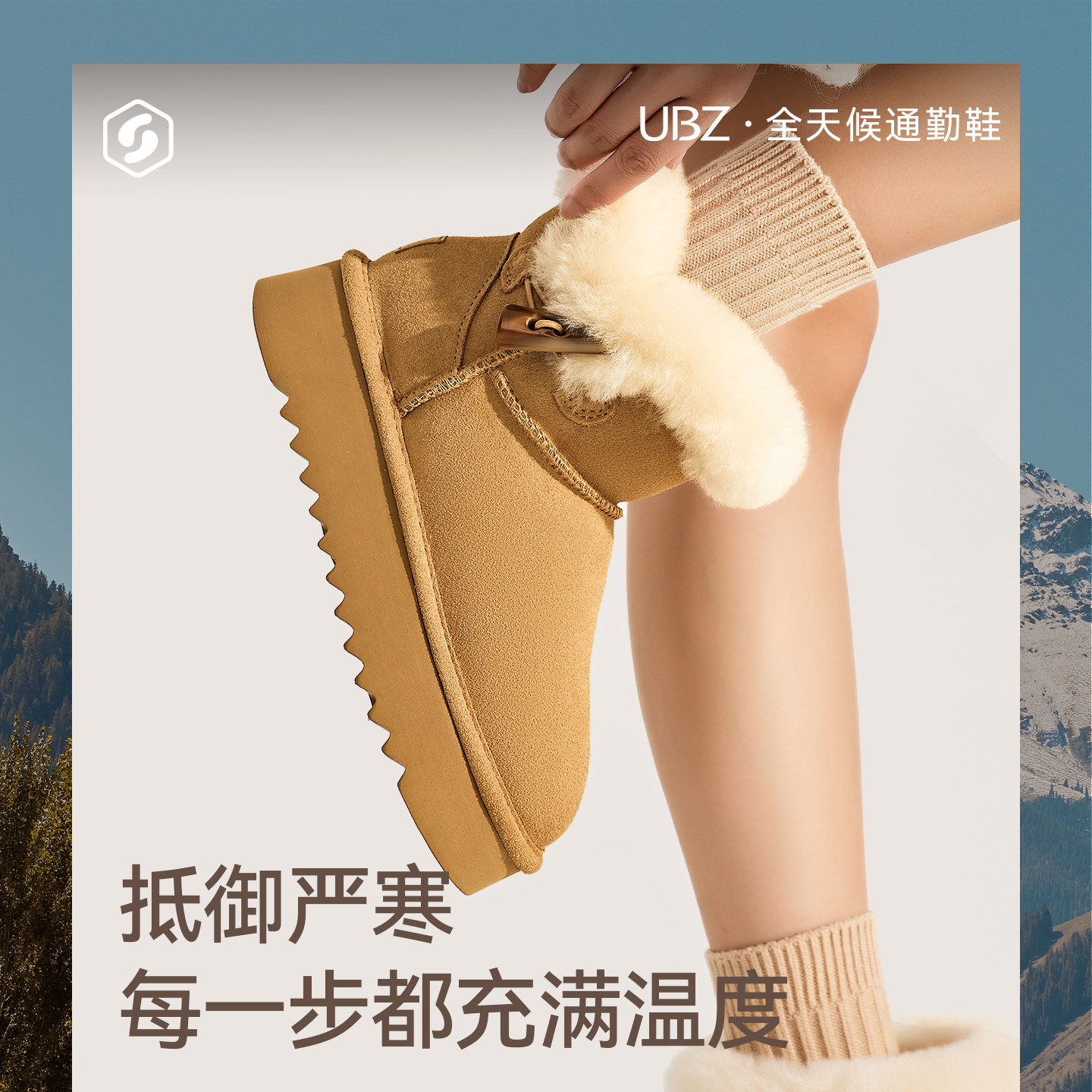 UBZ 防水厚底毛毛牛角扣雪地靴女2025冬加绒加厚东北保暖增高棉鞋