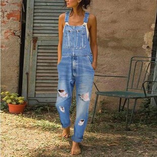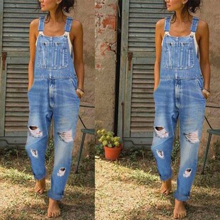 女 连体裤 欧美风速卖通时尚 简约破洞口袋水洗休闲吊带牛仔背带长裤