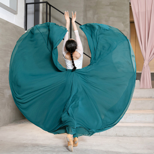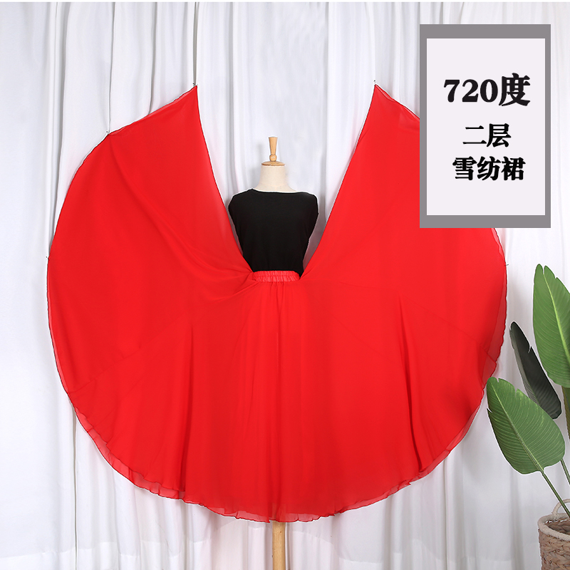 720度双层雪纺大摆裙 复古沙滩半身裙松紧高腰红色洋气舞蹈演出裙