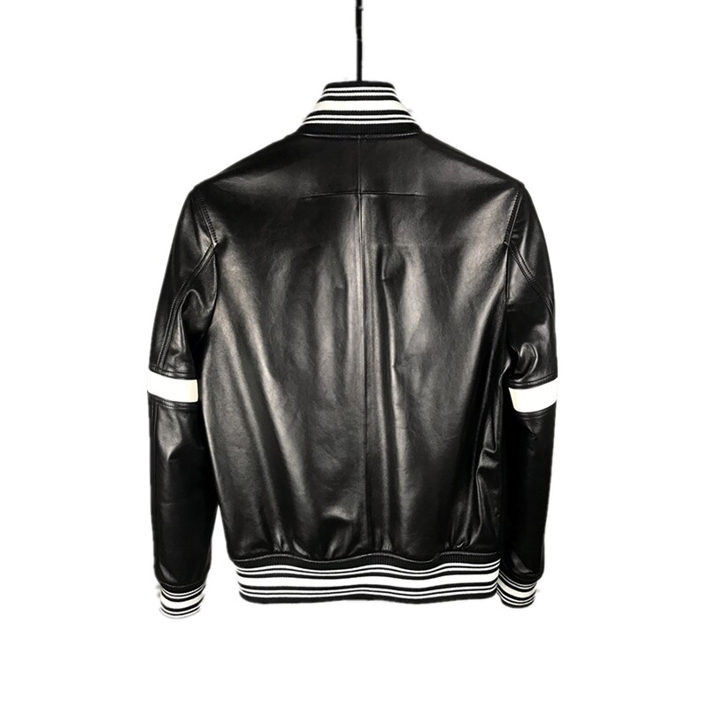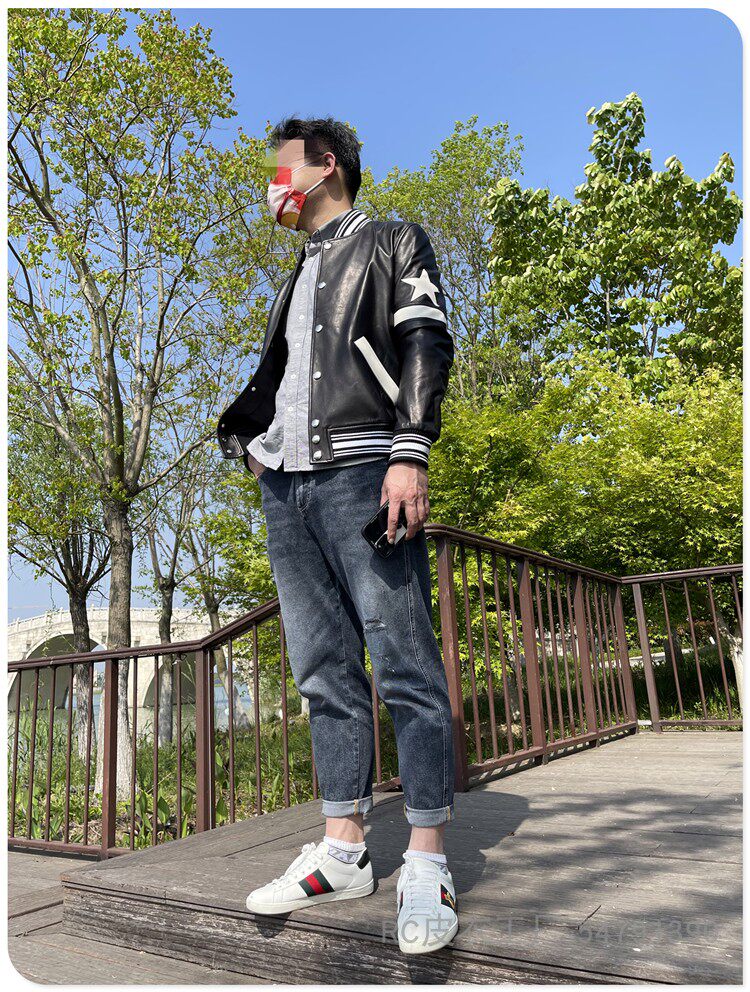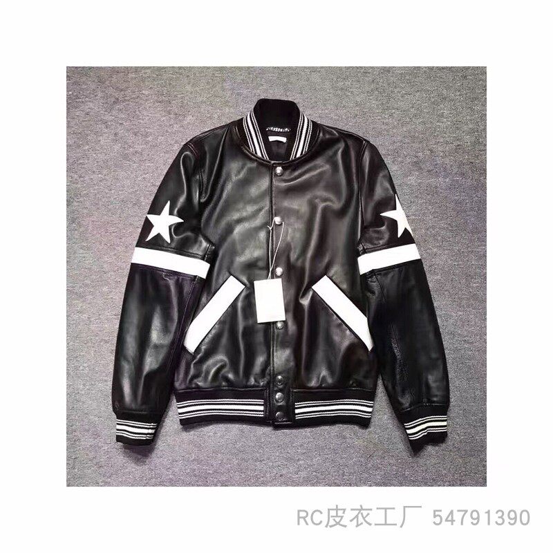 小羊皮经典 真皮男白五角星运动袖 棒球夹克皮衣 走秀款 RC欧货