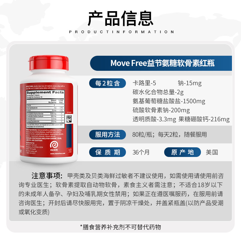 益节MoveFree绿瓶氨糖软骨素MSM中老年养护关节120粒绿标养护关节