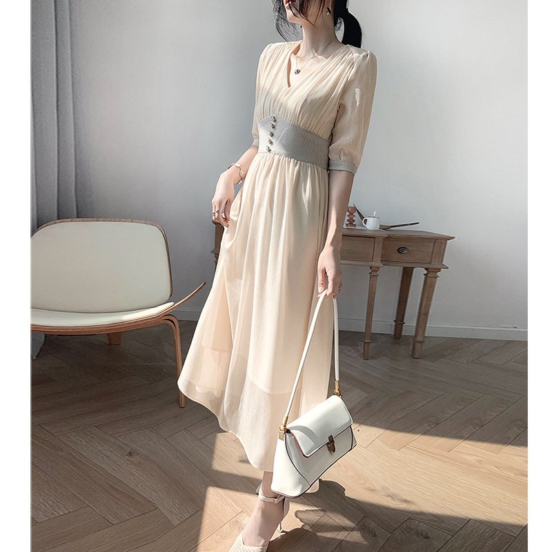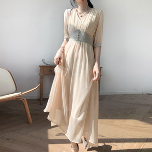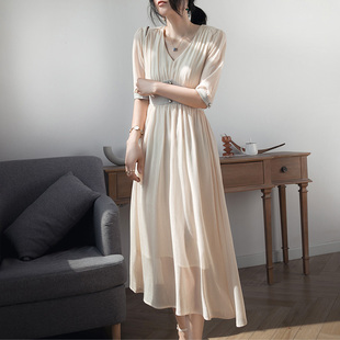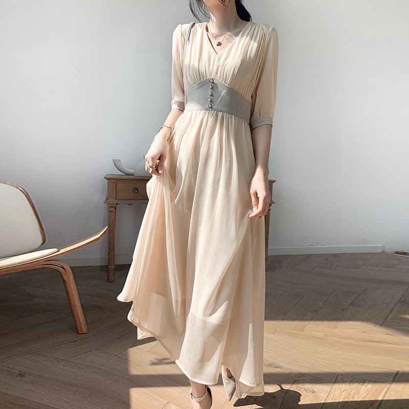 淑女风收腰显瘦a字连衣裙 V领气质洒金雪纺连衣长裙 2020秋季 新款