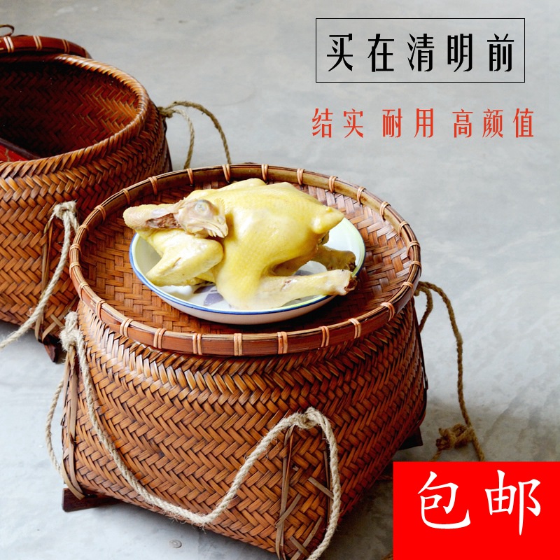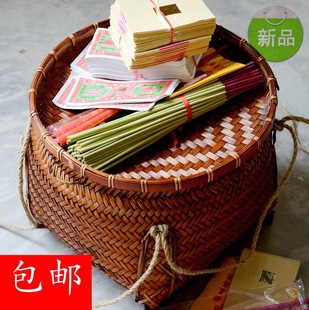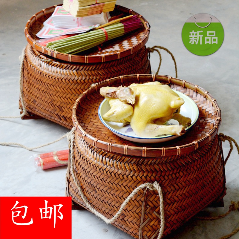 竹编收纳筐带盖子家用竹筐结婚用竹匾担竹编制品拜神竹编筐有盖