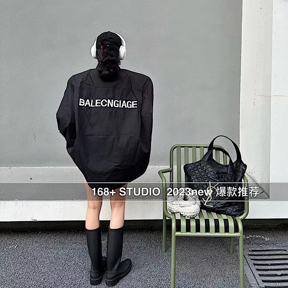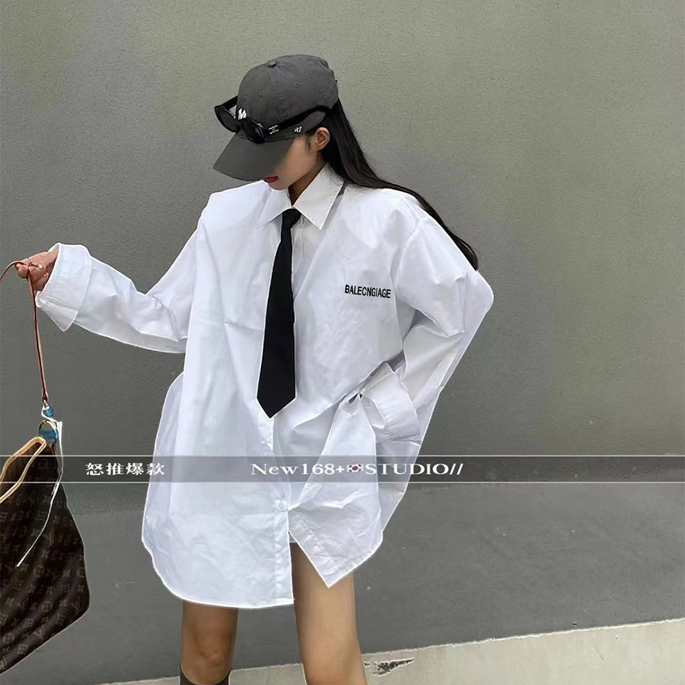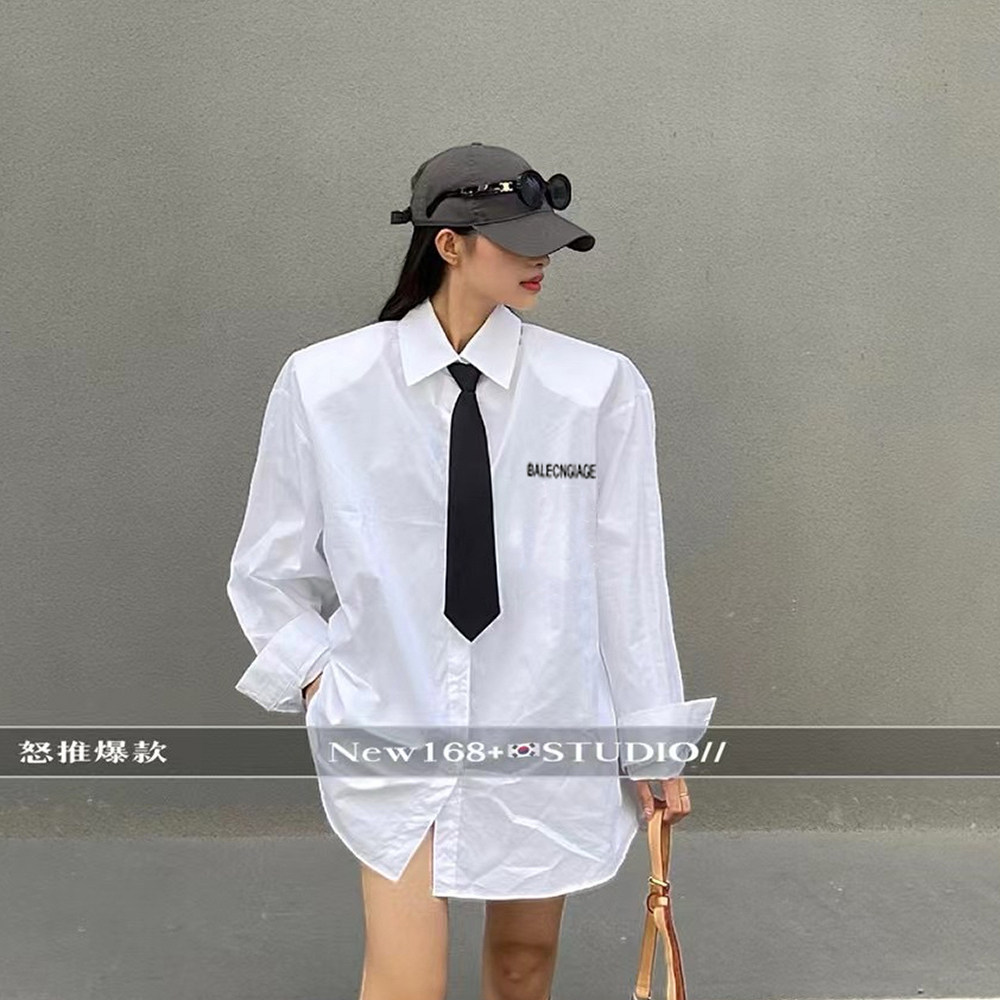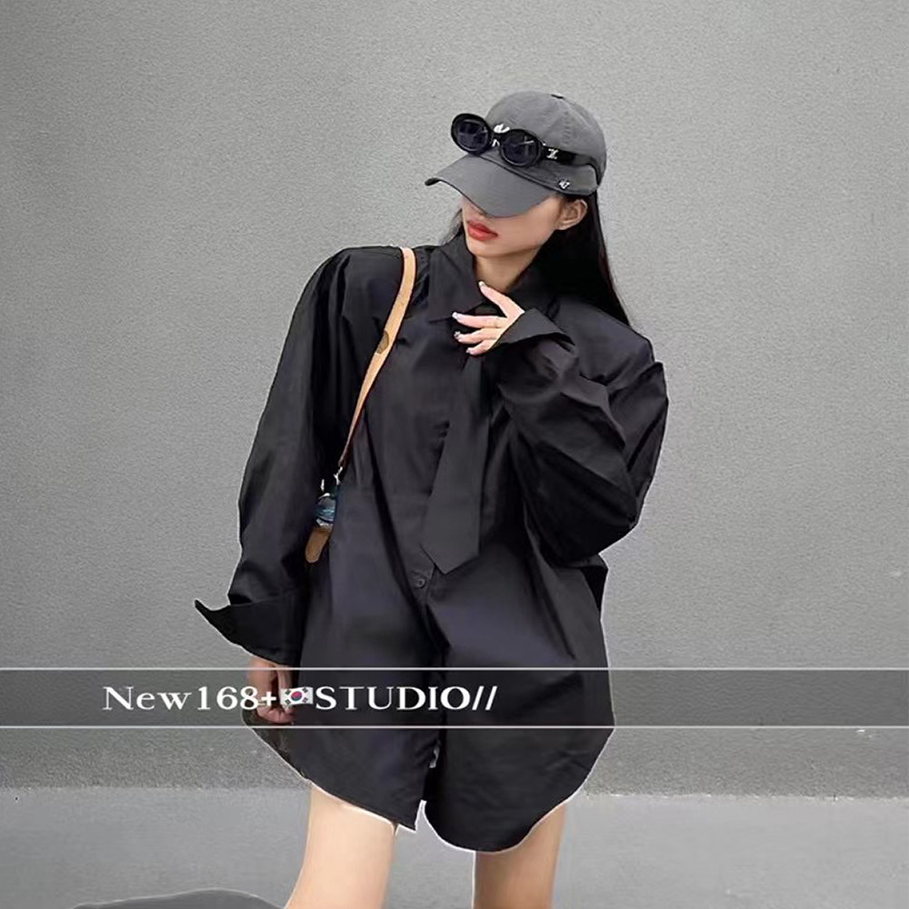 立领开衫 黑色垫肩纯色领带衬衫 洋气长袖 中长款 外套 上衣女宽松韩版