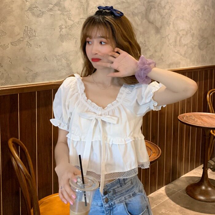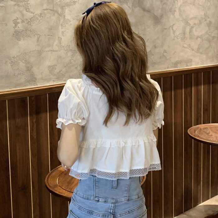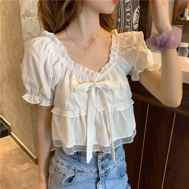 女士夏装 衬衫 新款 宽松上衣法式 别致衬衣 大码 短袖 胖mm蝴蝶结泡泡袖