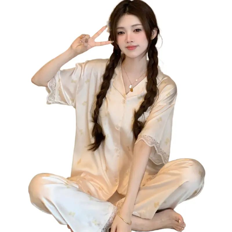 短袖 夏季 长裤 薄款 冰丝睡衣女款 家居服女士夏天仿真丝套装 2025新款