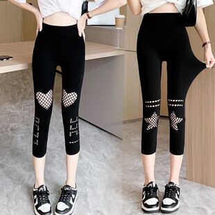 七分裤 2024打底裤 胖MM紧身显瘦小脚裤 破洞网孔弹力大码 外穿 夏薄款