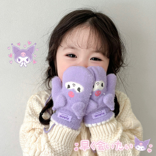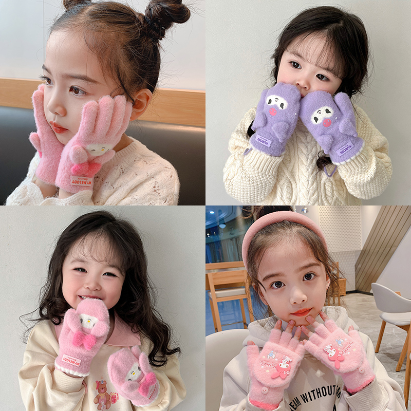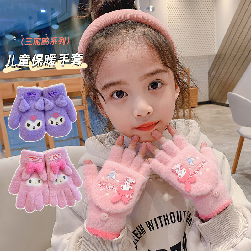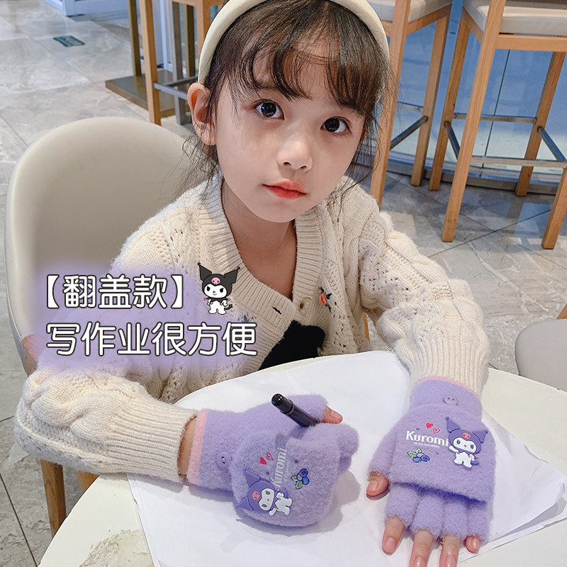 儿童手套秋冬季 保暖可爱小孩卡通库洛米女童半指翻盖宝宝五指写字