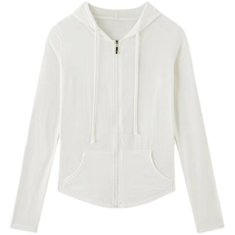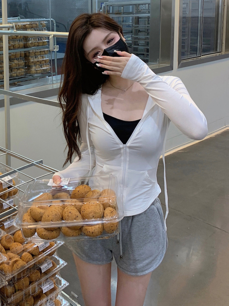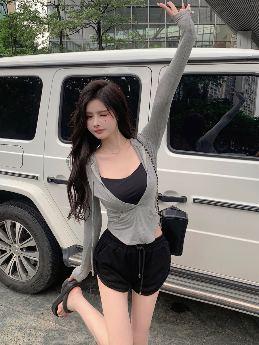 灰色抽绳连帽长袖 收腰运动上衣外搭 T恤女夏秋纯欲风显瘦防晒开衫