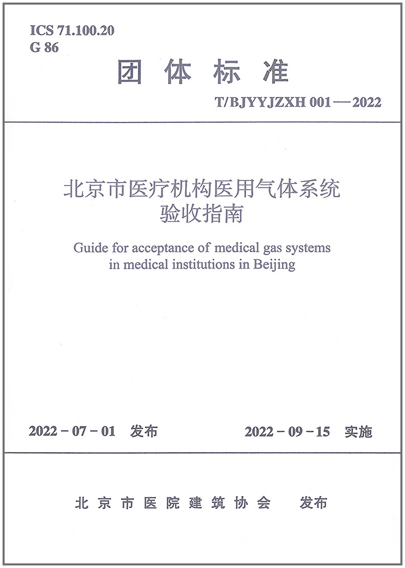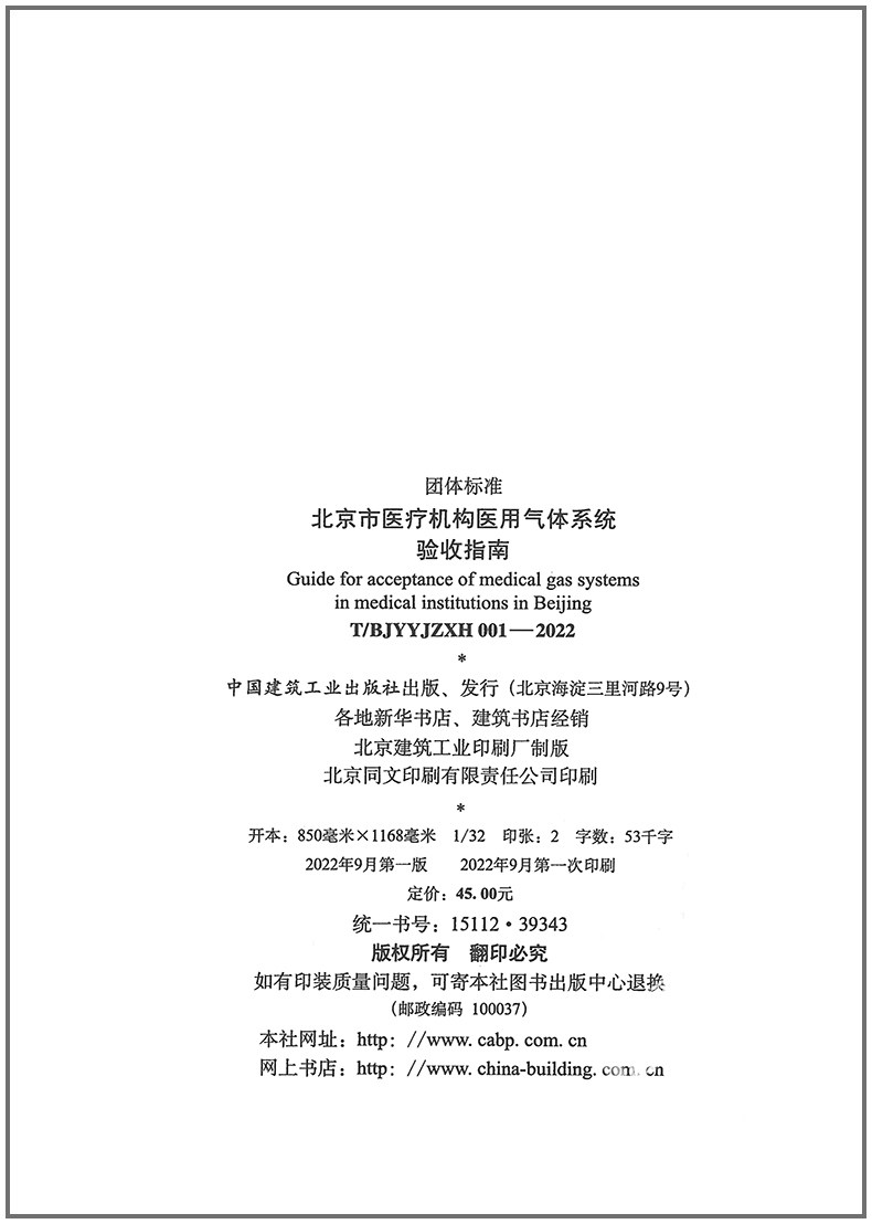 由北京市医院建筑协会委托中国建筑工业出版 北京市医疗机构医用气体系统验收指南T 自2022年9月15日实施 2022 社发行 BJYYJZXH001