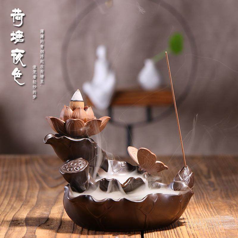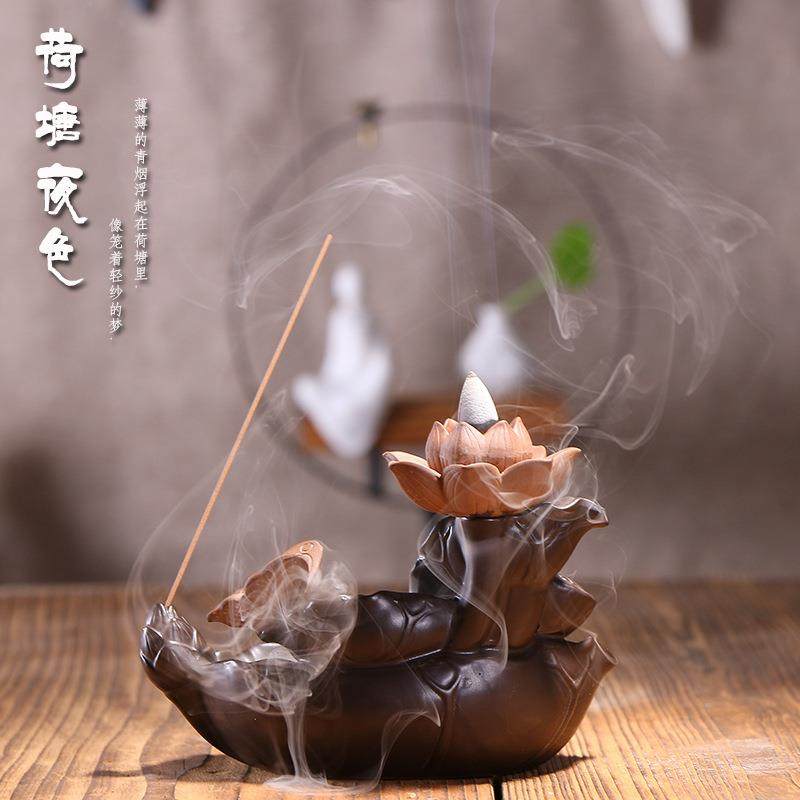 供应陶瓷香薰炉倒流香炉 创意荷塘月色香炉茶道摆件香炉莲花荷叶