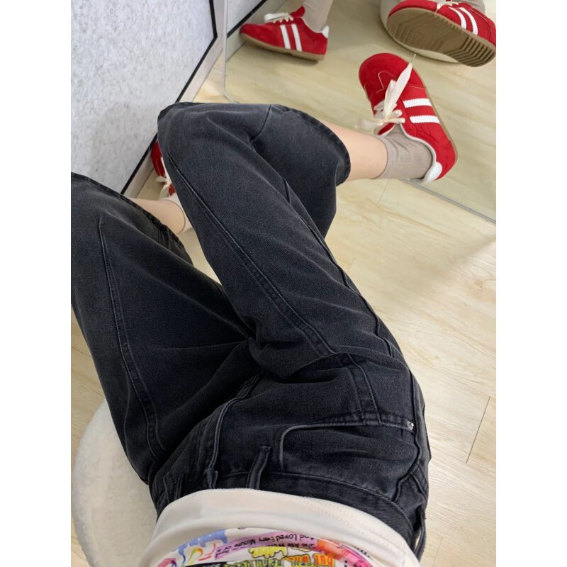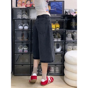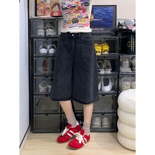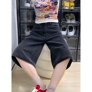 胖mm宽松显瘦高腰直筒阔腿中裤 女夏季 复古黑灰色七分牛仔短裤 大码