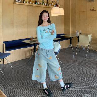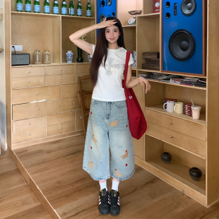 女夏休闲阔腿显瘦百搭中裤 橘子树在哪儿美式 趣味毛巾绣牛仔七分裤