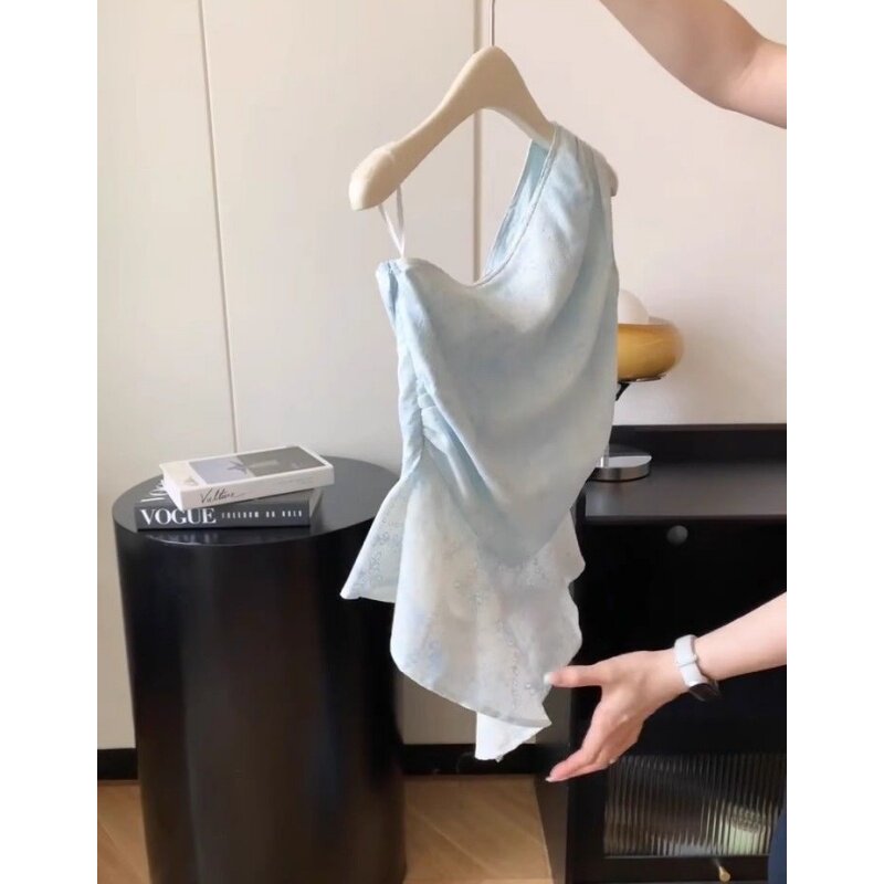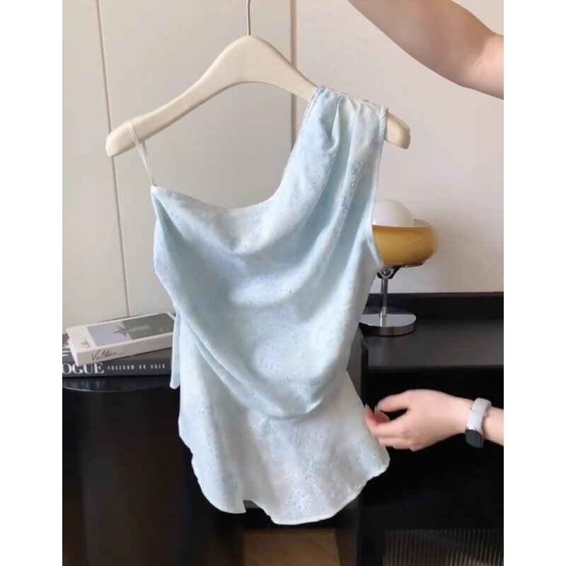 温柔风镂空斜领上衣女不规则收腰显瘦露肩小衫 南油系列清货 法式