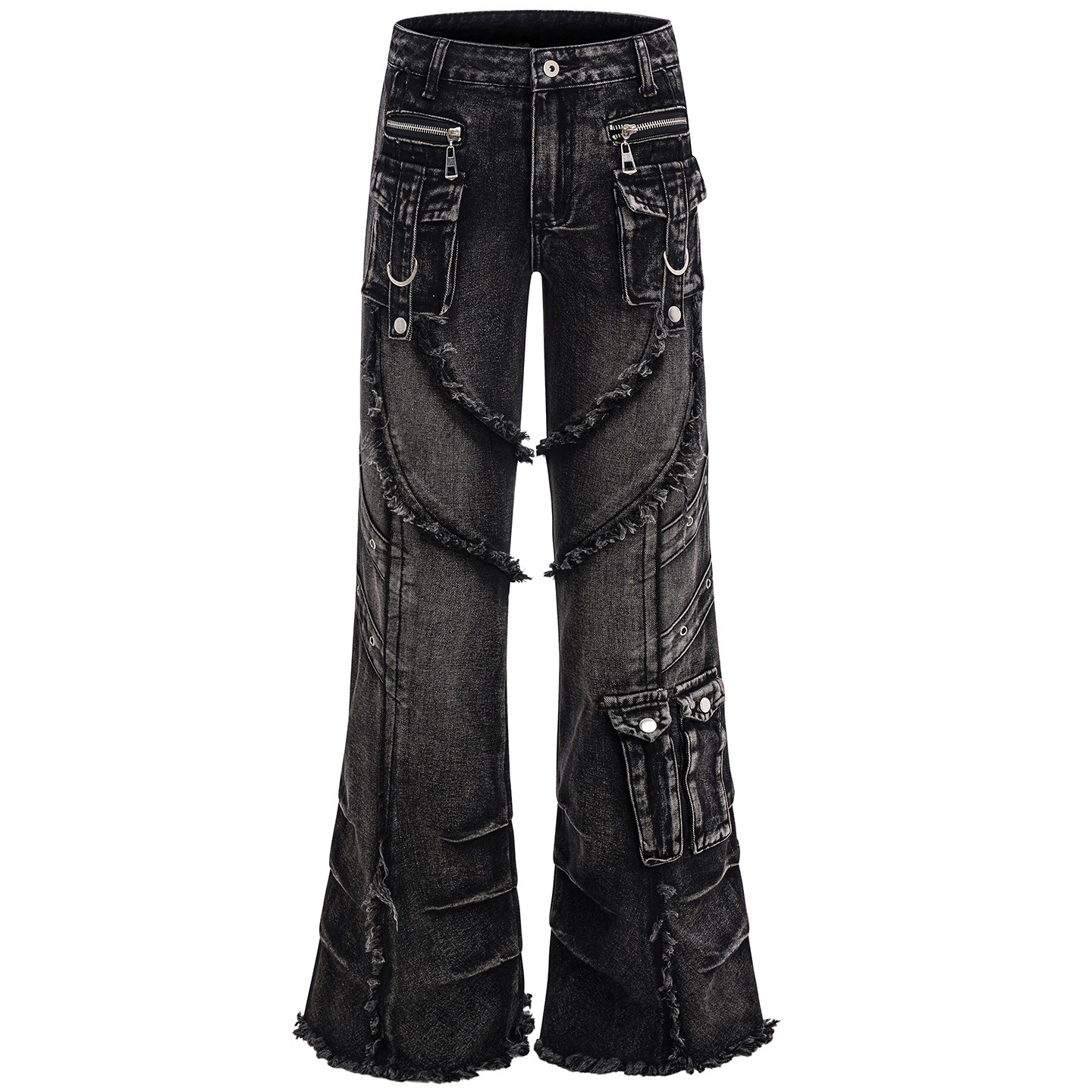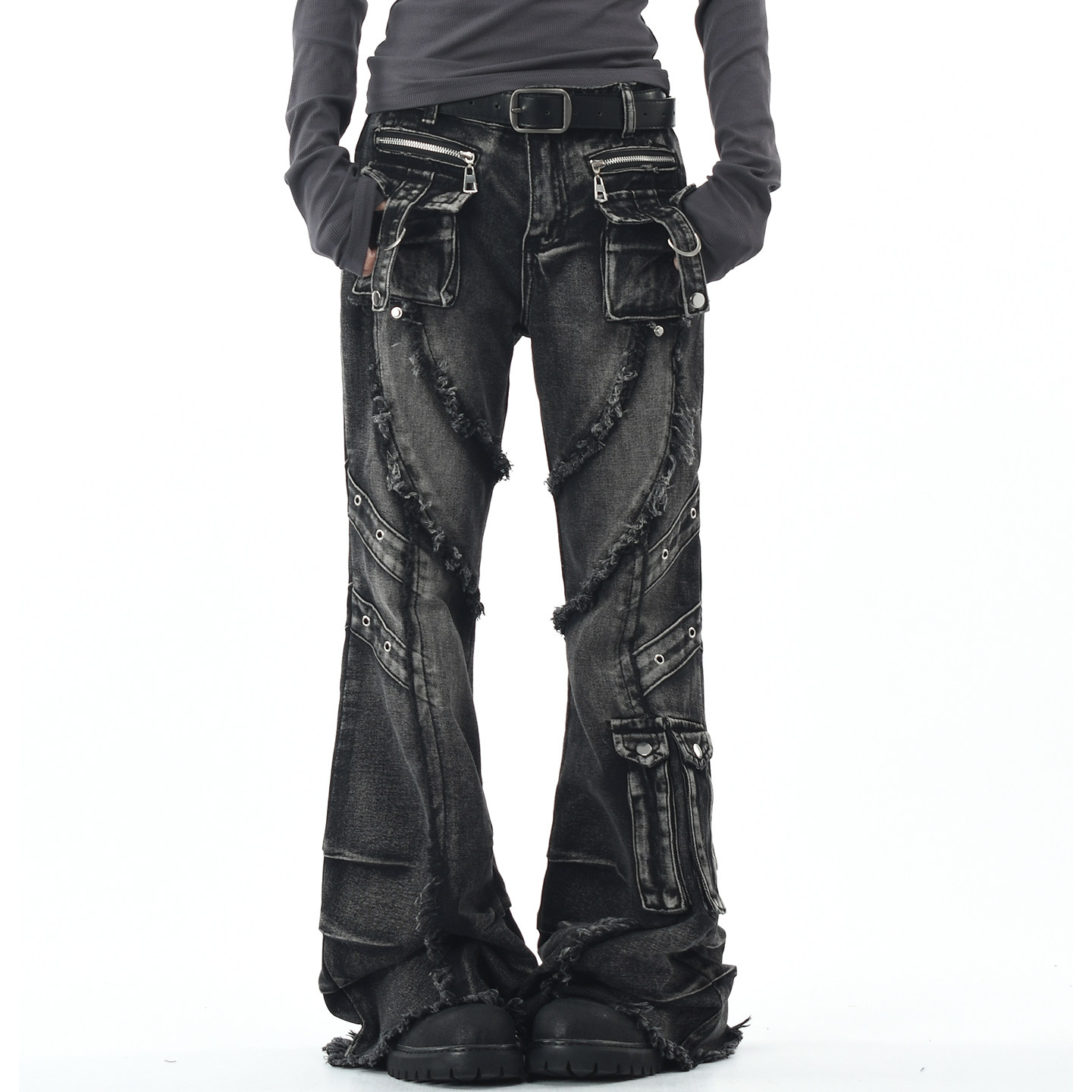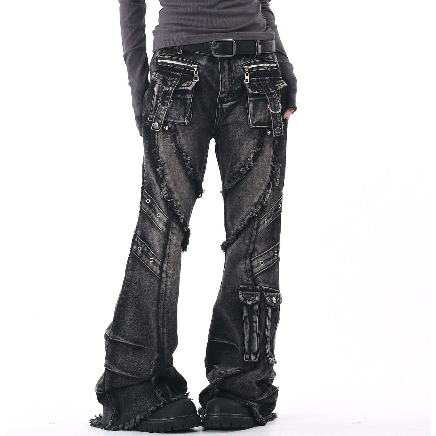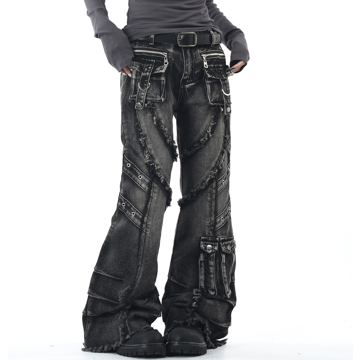 子 女亚文化朋克辣妹微喇叭长裤 OV原创美式 重工做旧水洗毛边牛仔裤
