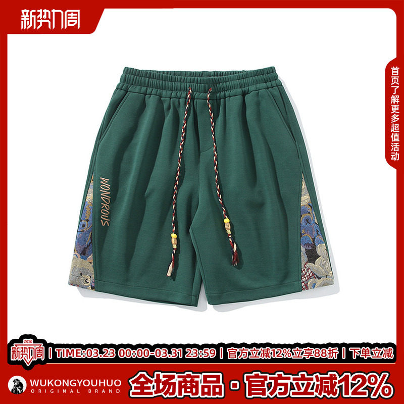 男复古潮牌宽松情侣短裤 悟空有货夏季 小熊提花拼接抽绳运动五分裤