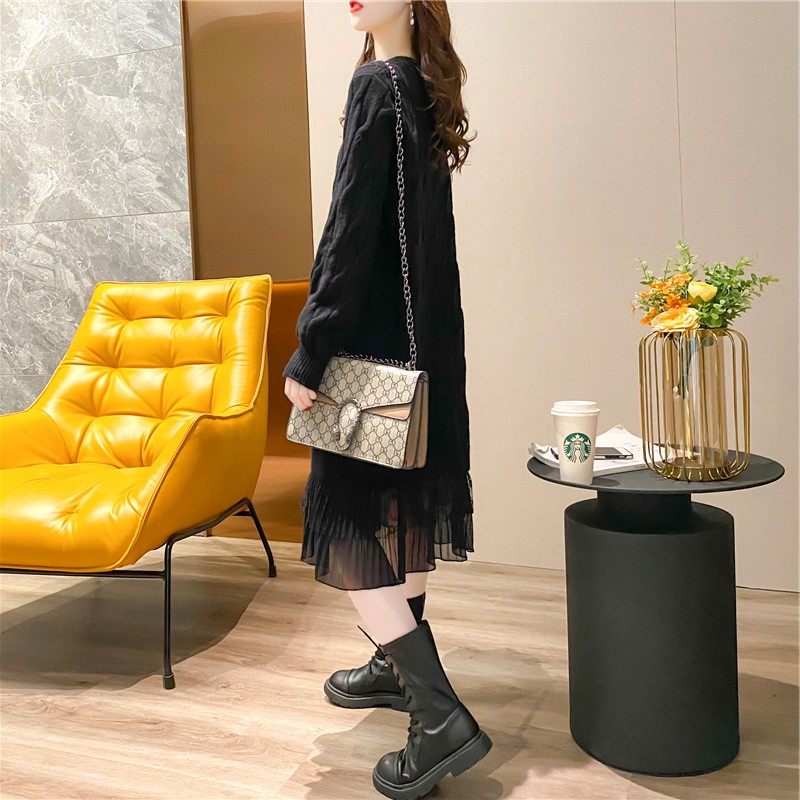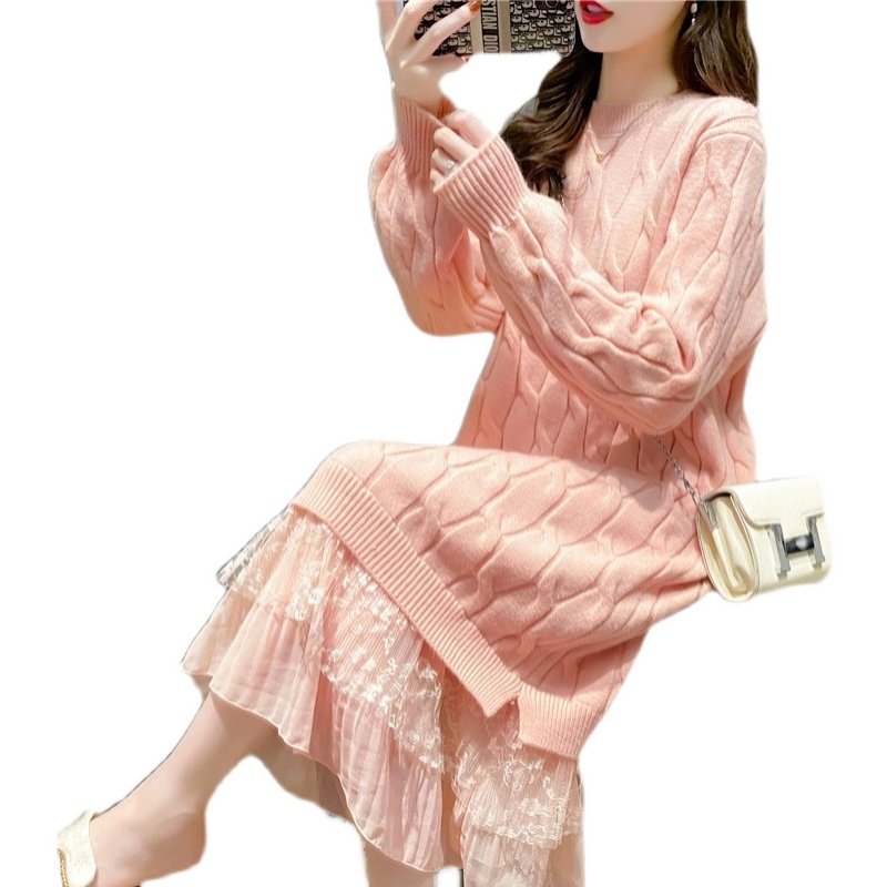 网红蕾丝拼接连衣裙毛衣女裙子慵懒风宽松韩版 麻花毛衣外穿百搭