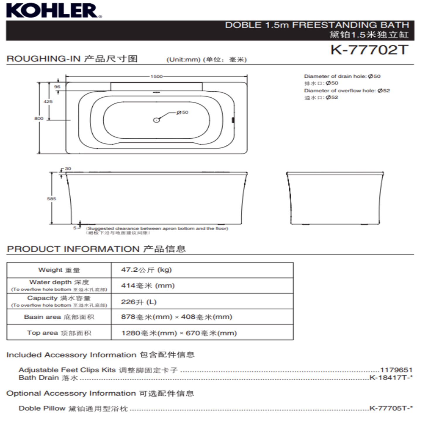 科勒K 亚克力浴缸含排水 77702T黛铂1.5米独立式