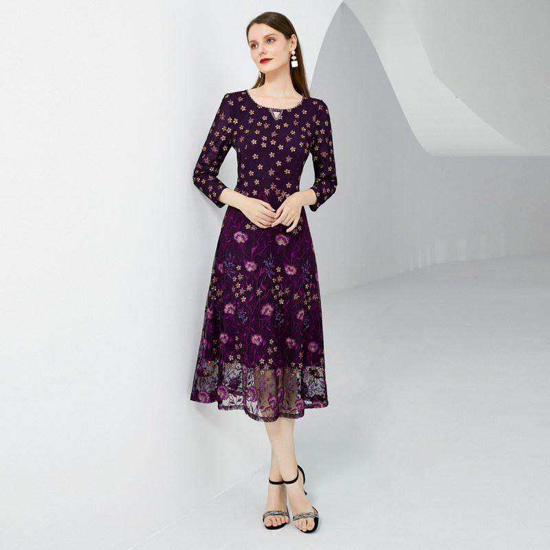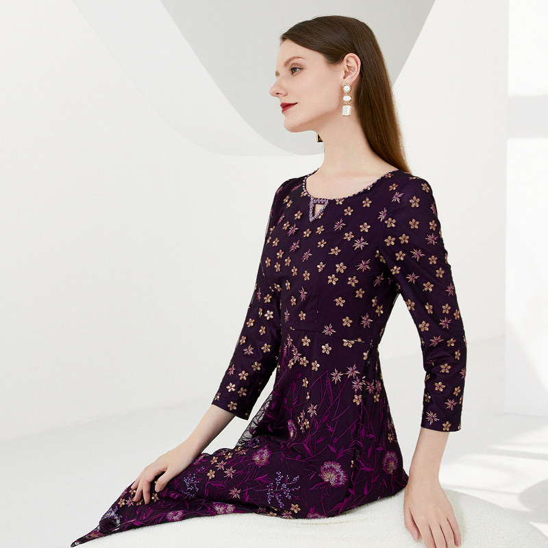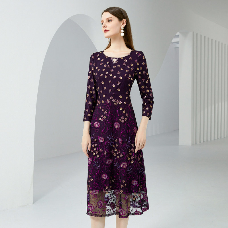 礼服裙气质 紫色蕾丝圆领刺绣连衣裙子收腰长款 马天奴女装 秋冬新款