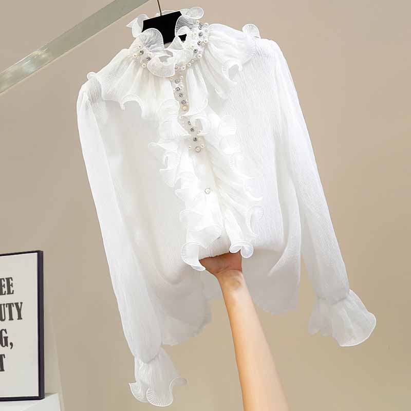 法式 女设计感高级雪纺名媛立领洋气衬衣 复古宫廷风重工荷叶边衬衫
