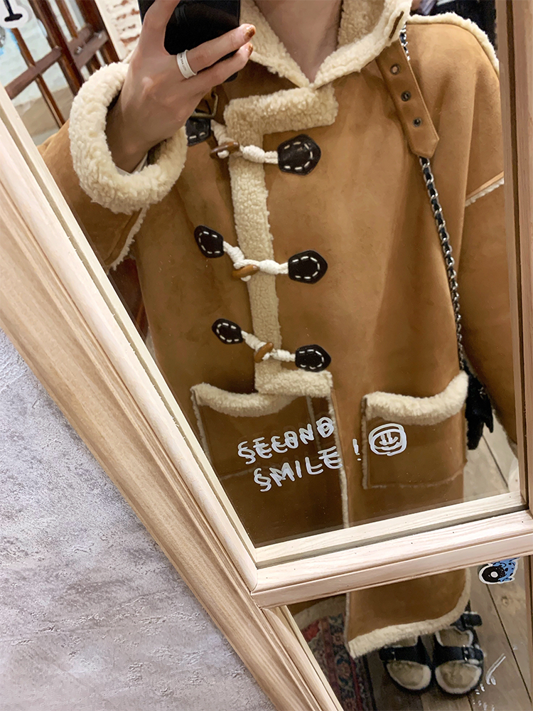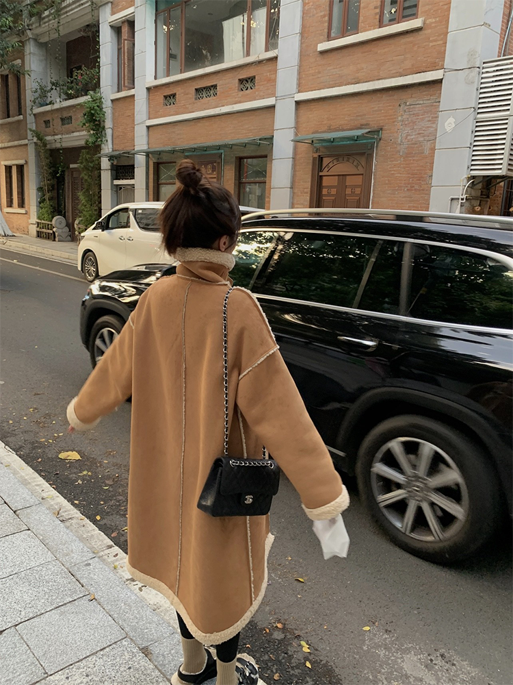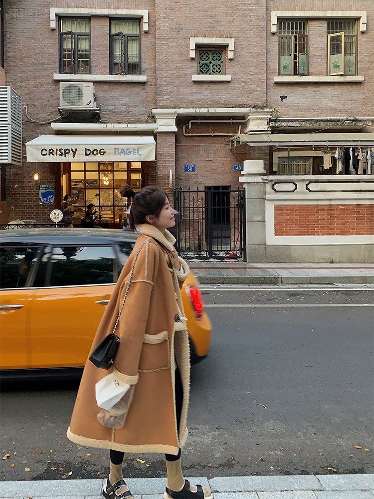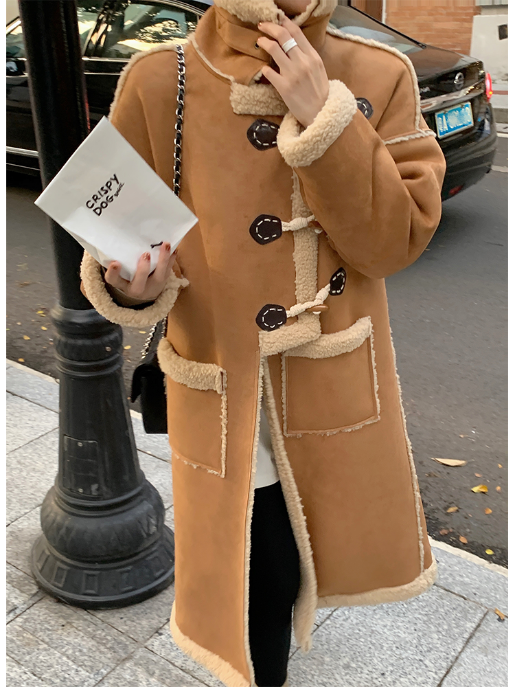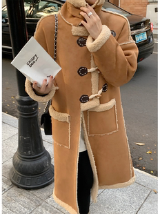 5G入冬韩系不规则牛角扣毛茸保暖麂皮羊羔毛棕色大衣外套 BLUE