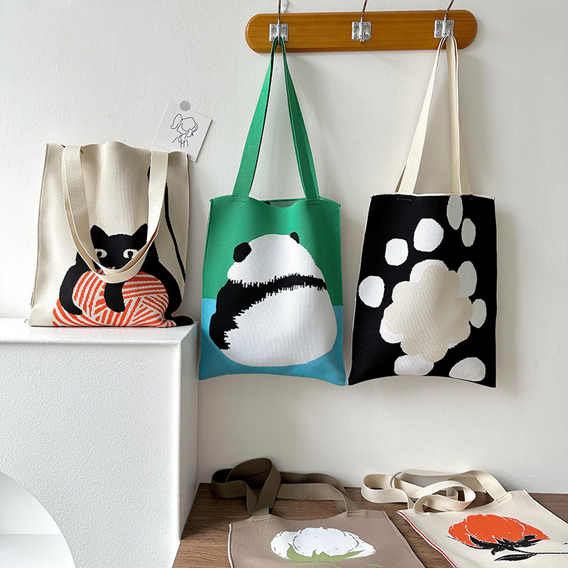 针织单肩斜跨编织托特包女可爱熊猫个性 书袋 百搭通勤大容量学生装