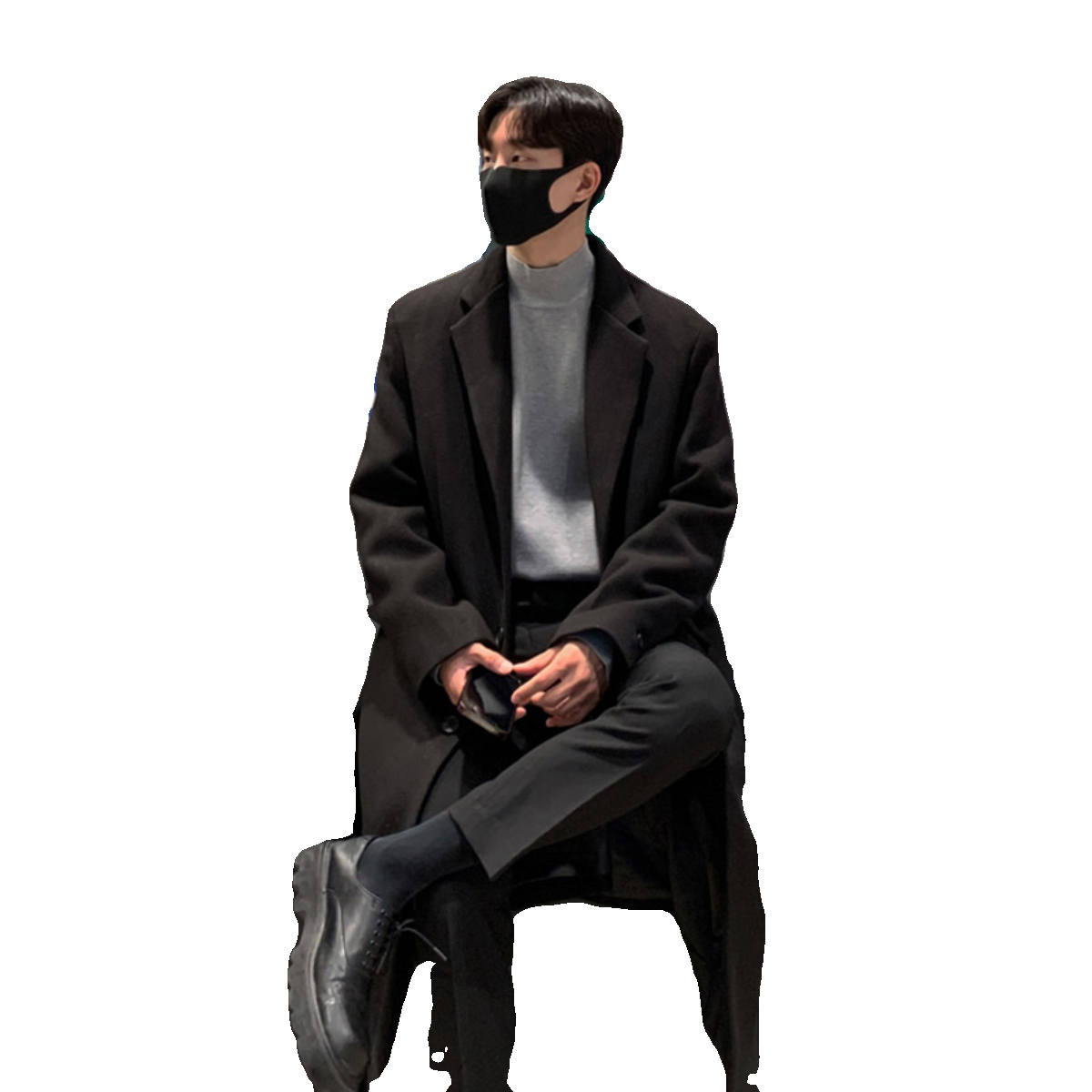 韩版 长款 呢子加厚风衣外套 2025春秋季 V37黑色高级感毛呢大衣男款