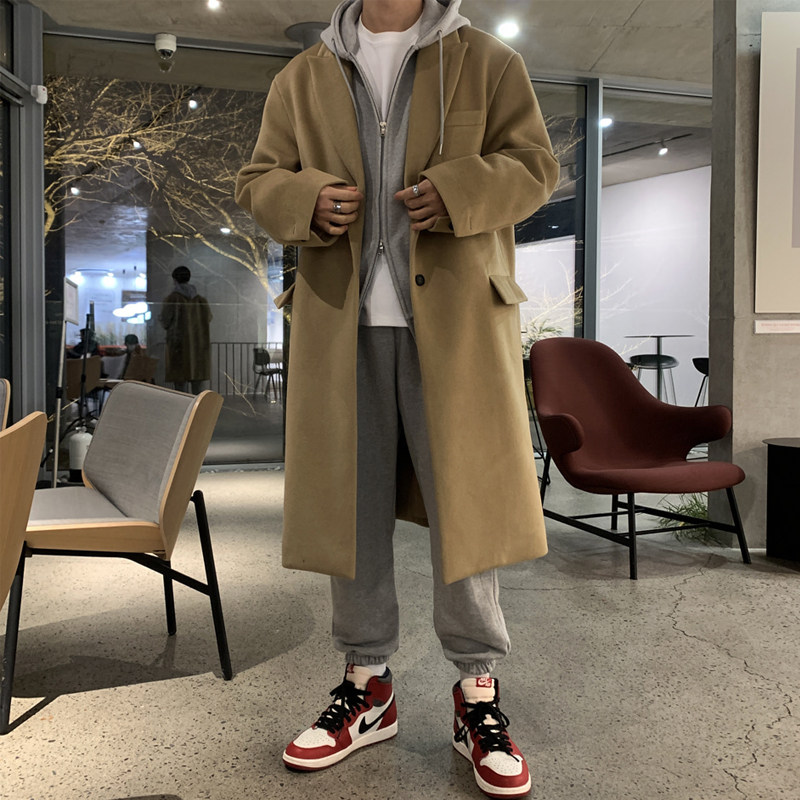 过膝韩版 顺毛呢子大衣男长款 宽松帅气毛呢外套男英伦风衣 新款 冬季