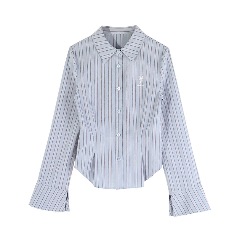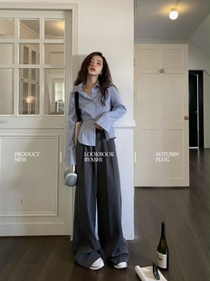sameuoo散养文化「银映」腰部抽褶摩登中性内搭白色条纹长袖 衬衫