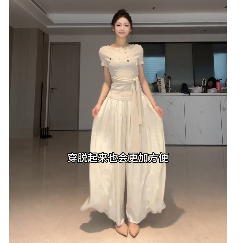 慵懒松弛高腰压褶阔腿休闲裤 时髦贝壳设计绑带短袖 T恤针织衫